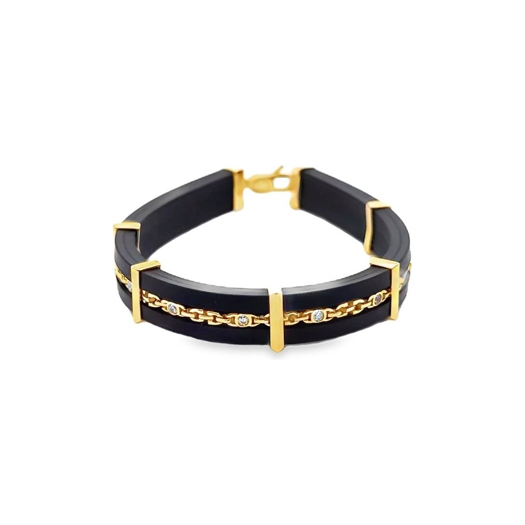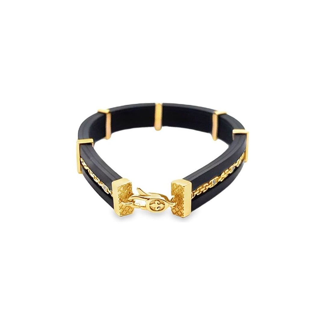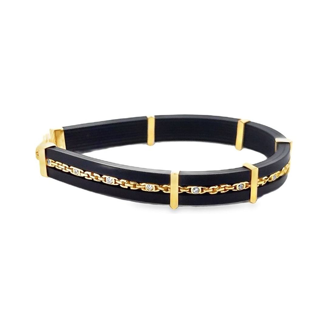 A sophisticated fusion of classic and contemporary design, this bracelet features a smooth black leather band enhanced by a central 18K gold chain adorned with brilliant round synthetic stones. The warm glow of gold and the sparkle of stones create a refined contrast against the matte leather, giving the piece a modern yet timeless appeal. Perfect for both casual and formal looks.