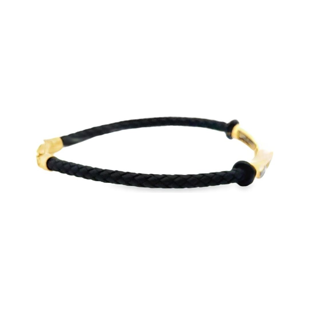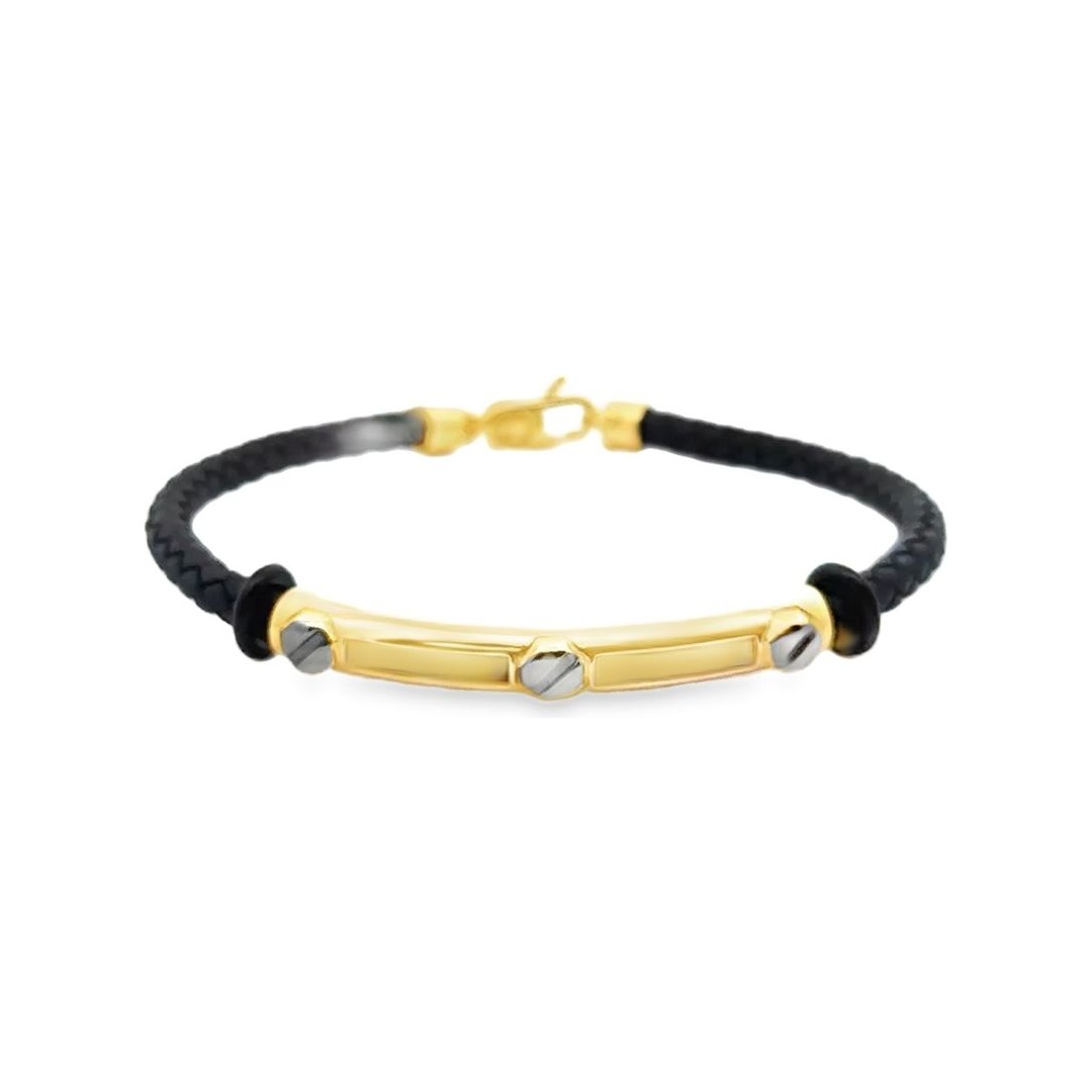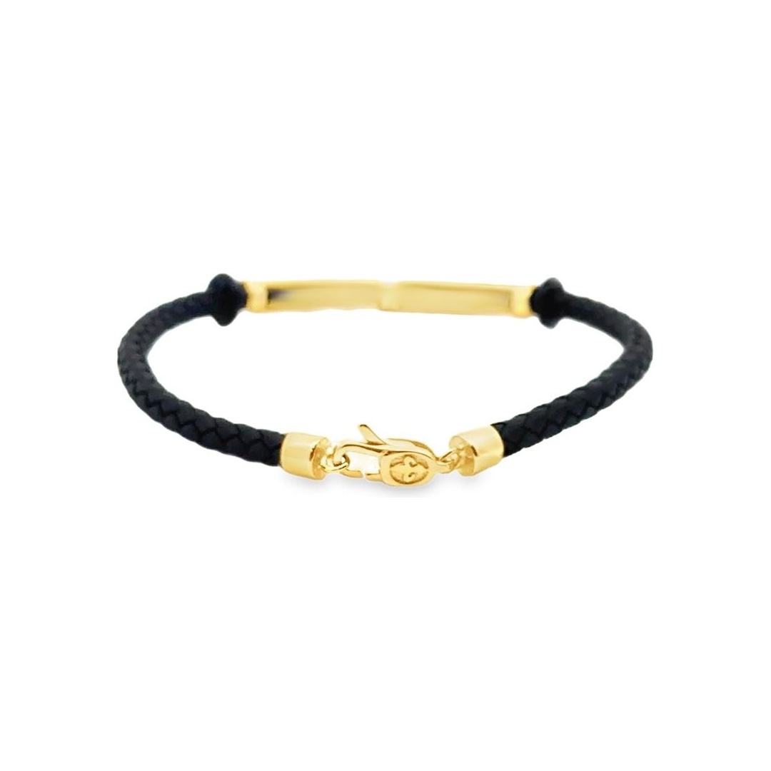 This sleek bracelet combines the texture of braided black leather with the refined brilliance of 18K gold detailing. Its rectangular gold panels and polished center highlight precision and craftsmanship, offering a sophisticated balance of strength and elegance. A perfect everyday accessory for men who value subtle luxury and timeless design.