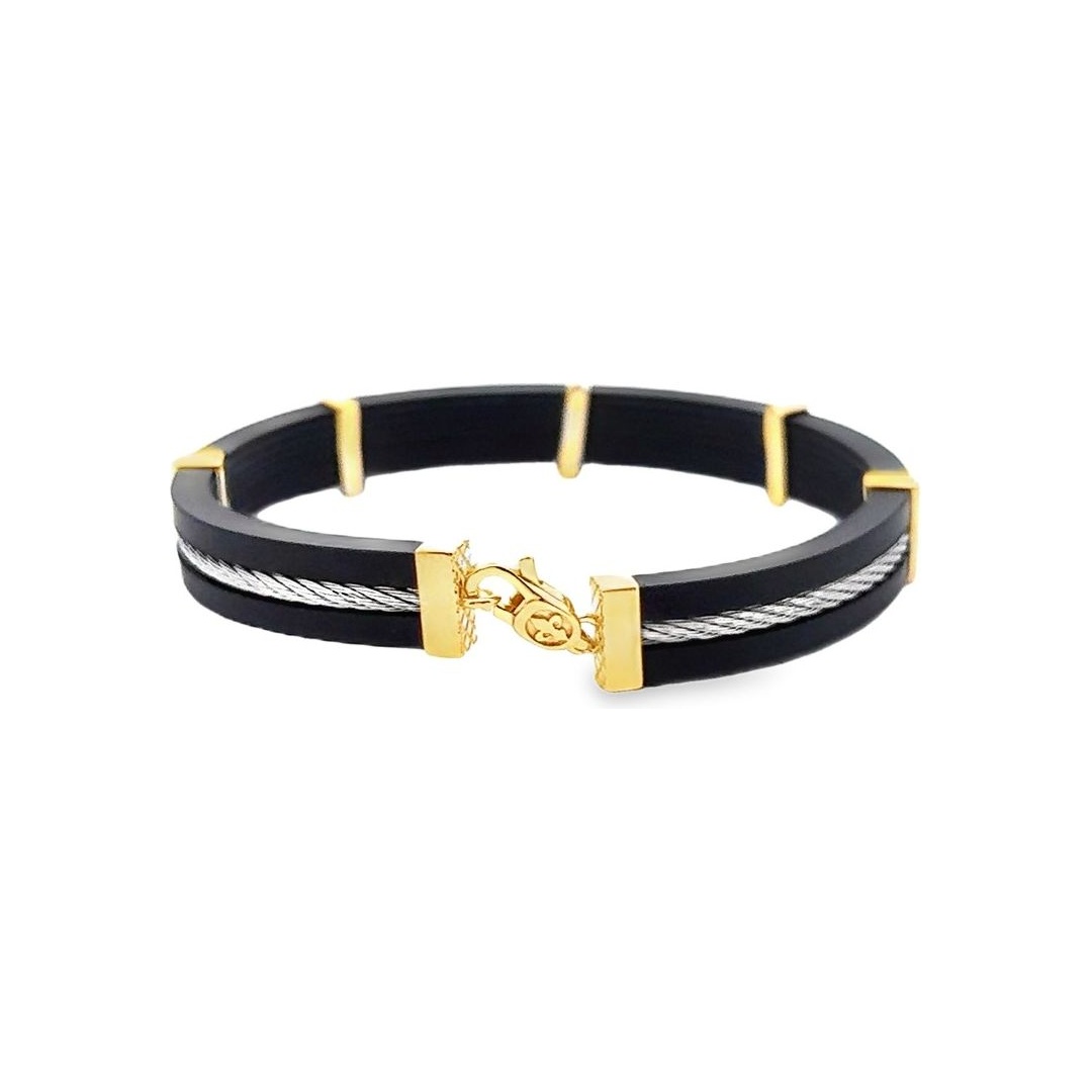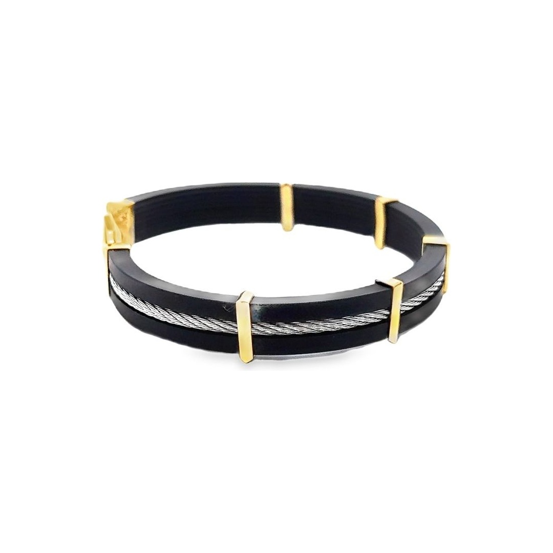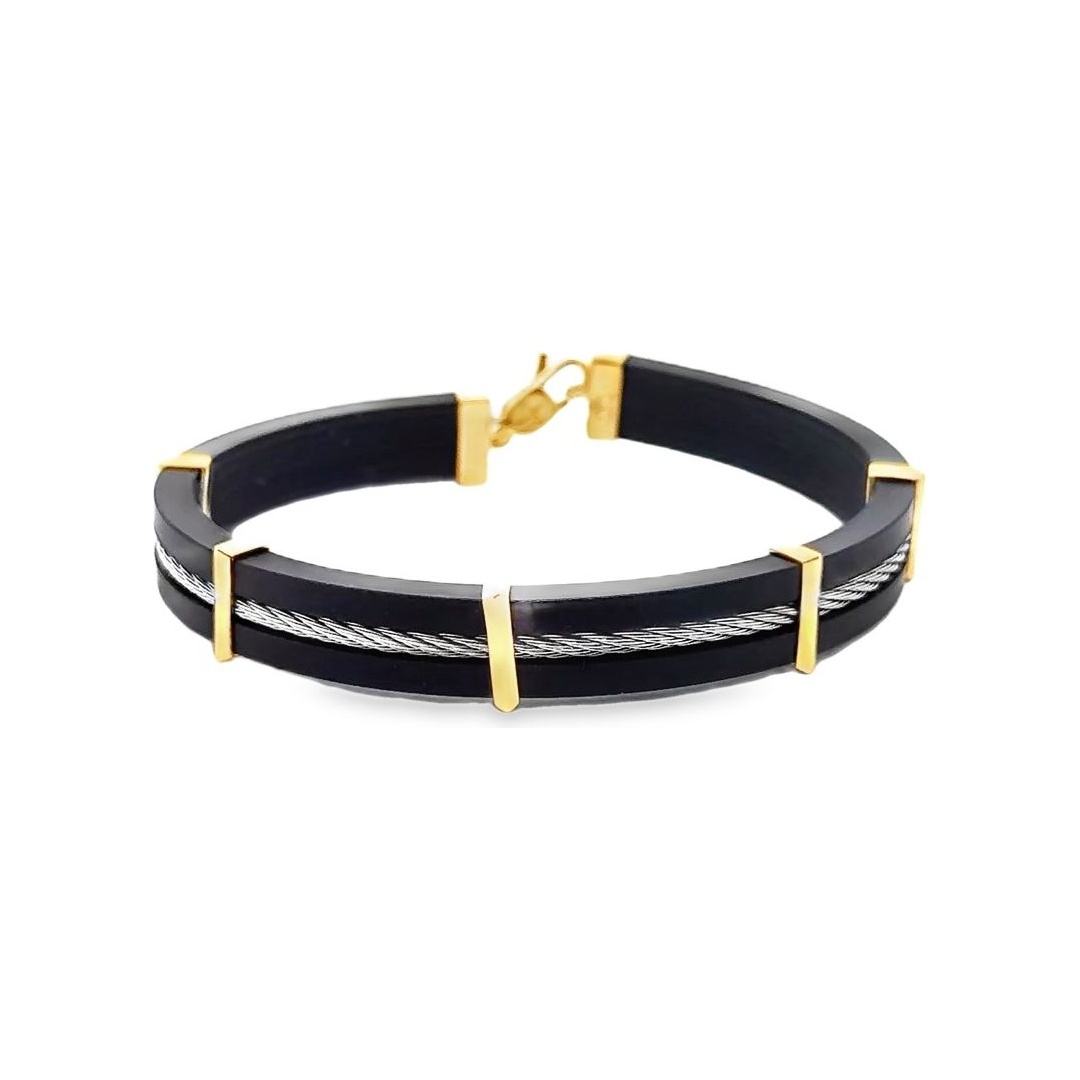 A striking balance of texture and elegance, this bracelet features a sleek black leather band paired with a central steel cable, framed by refined 18K yellow gold accents. The combination of cool metallic tones and warm gold creates a contemporary yet timeless design — perfect for the modern gentleman.