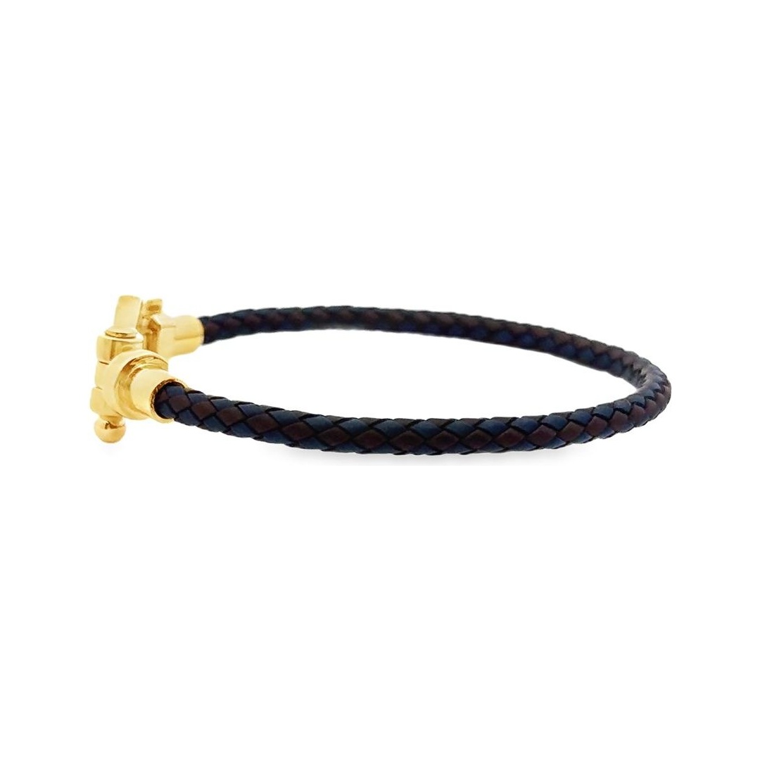 This distinctive bracelet showcases a braided black leather band paired with a sculptural 18K yellow gold centerpiece inspired by precision mechanics. The angular clasp motif exudes strength and sophistication, making it a statement accessory for the modern gentleman. The contrast of matte leather and polished gold creates a powerful yet refined look — perfect for everyday luxury.