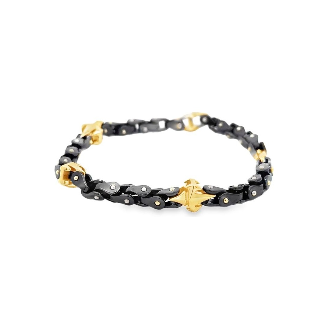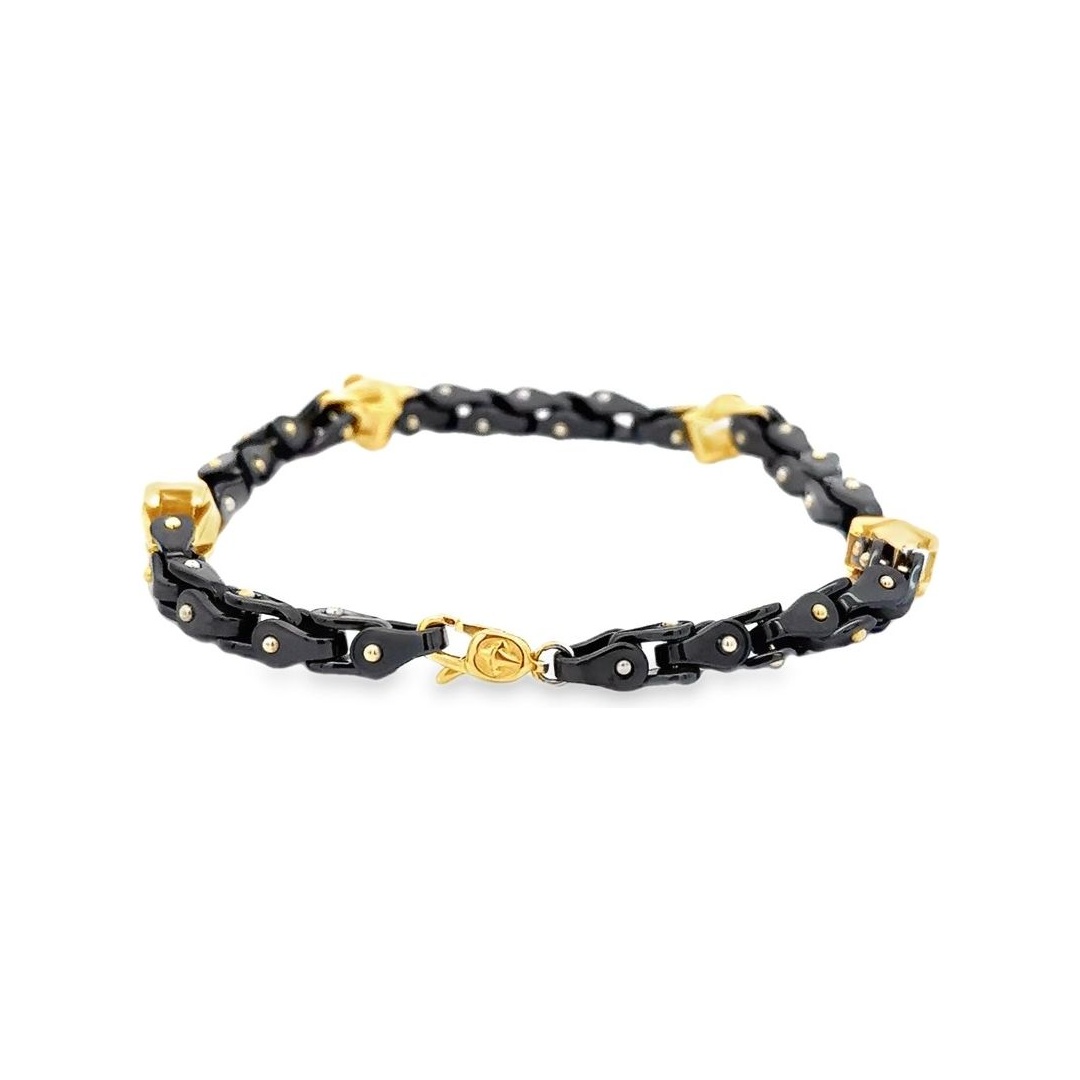This bold men’s bracelet features industrial-inspired black steel links, contrasted with finely detailed 18K yellow gold elements. The interplay of matte black and polished gold creates a striking balance between rugged strength and refined luxury. Designed for the modern man who appreciates craftsmanship with attitude, it’s a statement piece that transitions effortlessly from casual to formal wear.