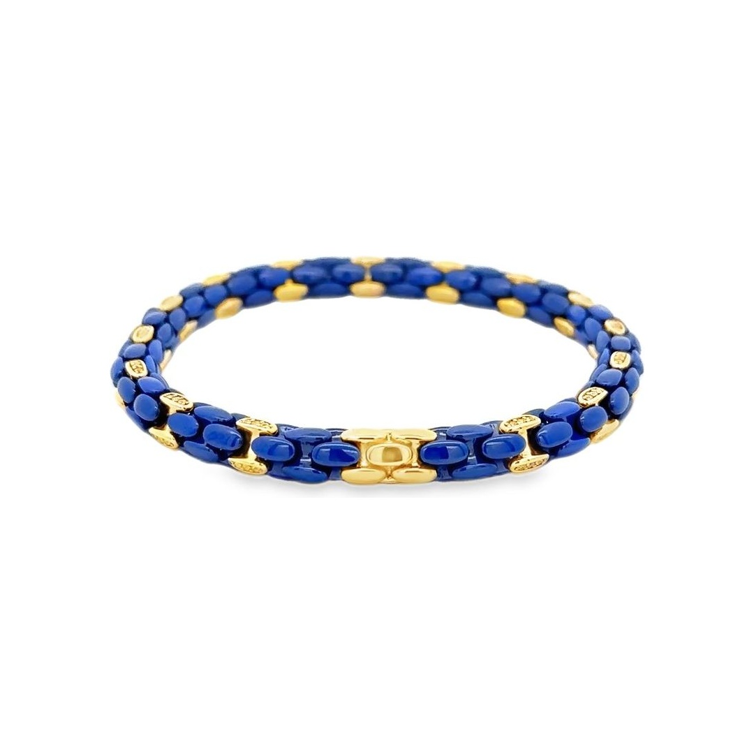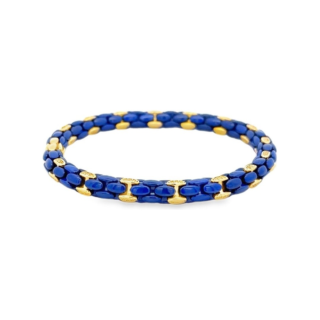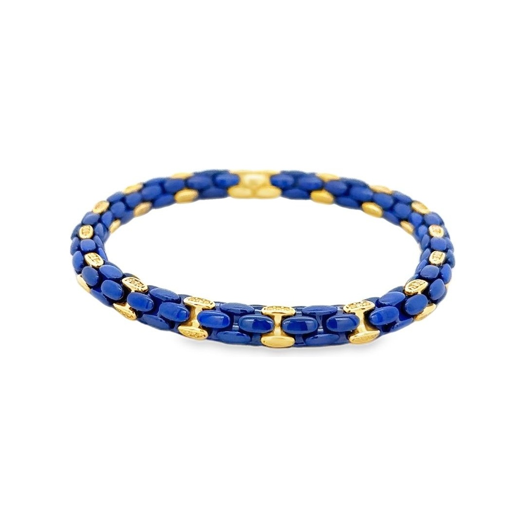 This modern stretch bracelet features deep blue ceramic-style links contrasted with refined 18K yellow gold accents. The flexible, easy-to-wear design combines comfort with contemporary elegance, while the vivid blue tone brings a fresh and confident energy to any look. A versatile piece that effortlessly blends casual sophistication with timeless luxury.