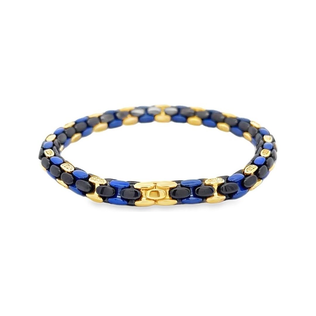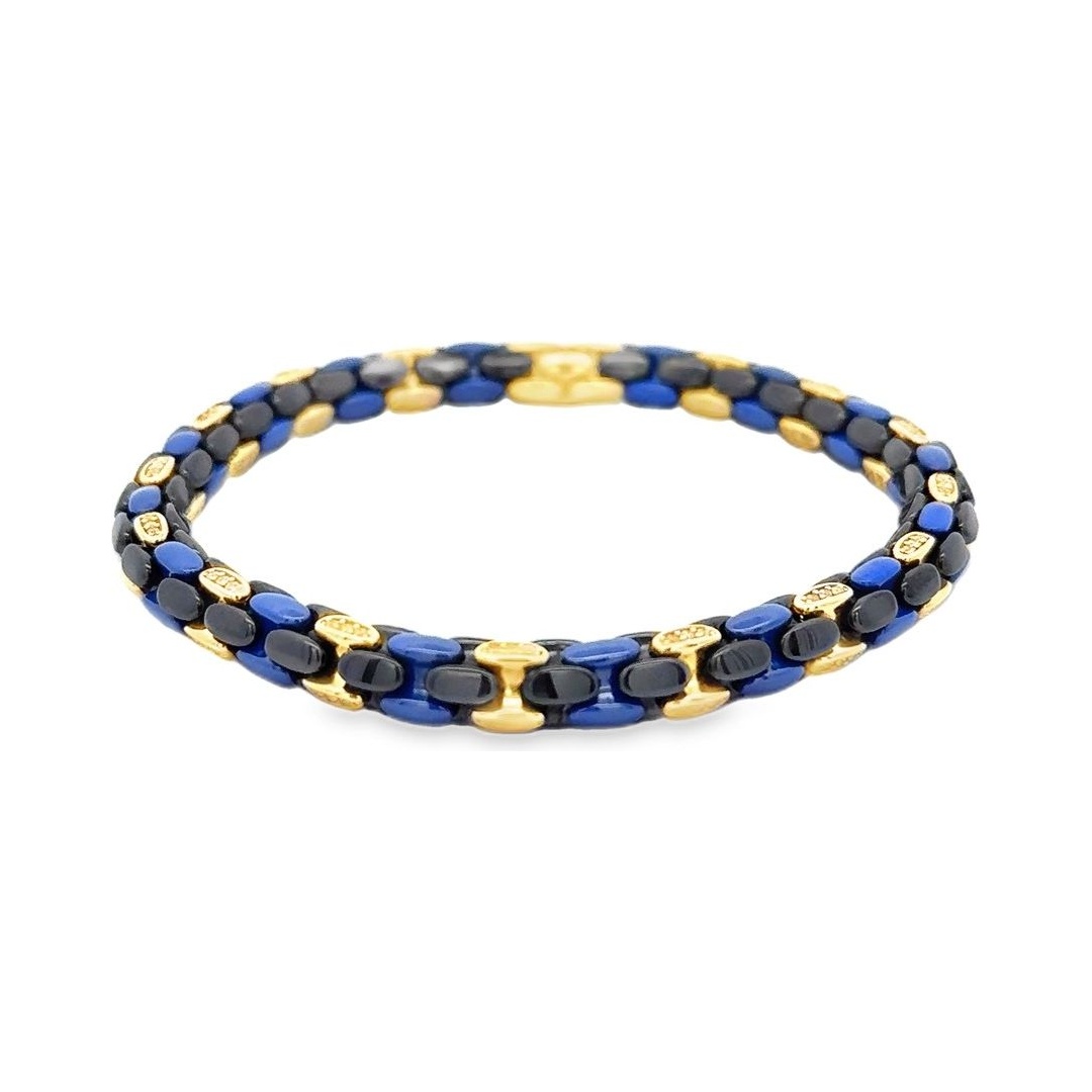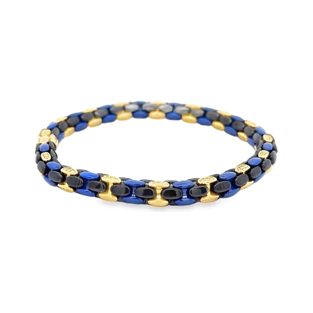 A modern and comfortable stretch bracelet designed for effortless wear. Crafted with 18K yellow gold details and contrasting black and blue links made from non-gold materials, it combines flexibility with a striking contemporary look. The smooth stretch design allows easy fit while maintaining a refined and luxurious style.