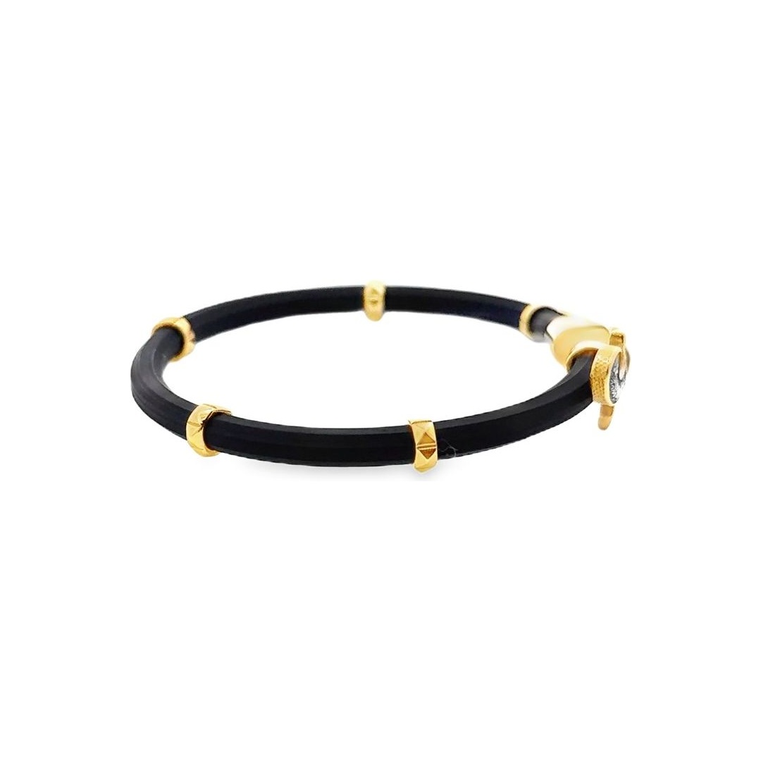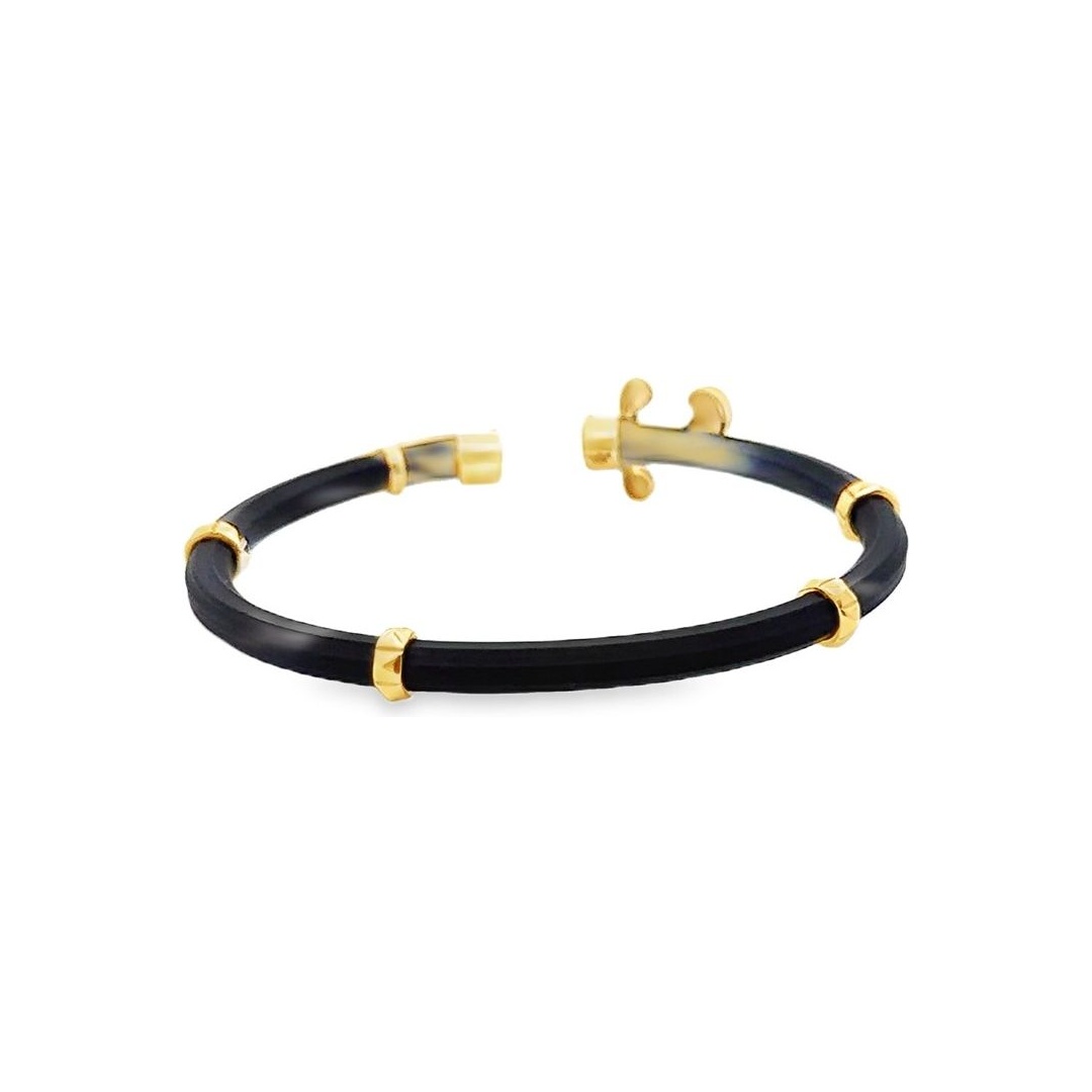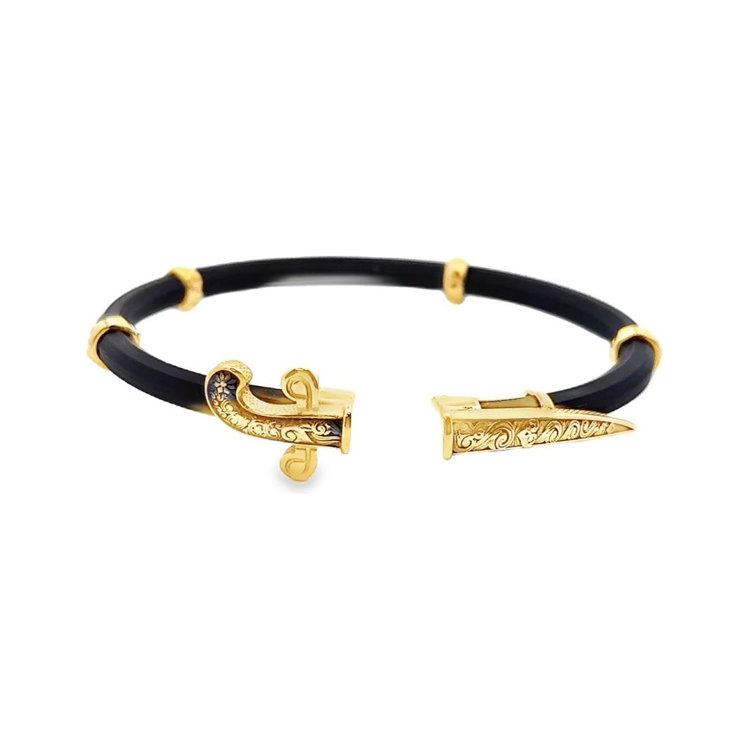 An artistic 18K yellow gold bracelet featuring a sleek black leather band and intricately engraved gold dagger motifs on both ends. The detailed craftsmanship on the gold highlights traditional artistry, while the open-cuff design adds a modern, masculine edge. A statement piece that fuses luxury, heritage, and bold character.