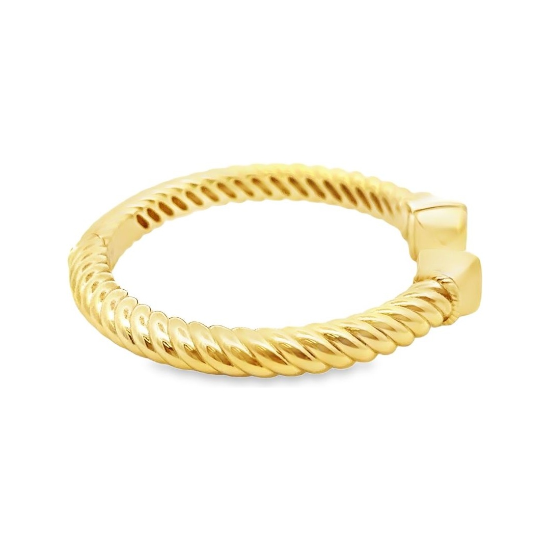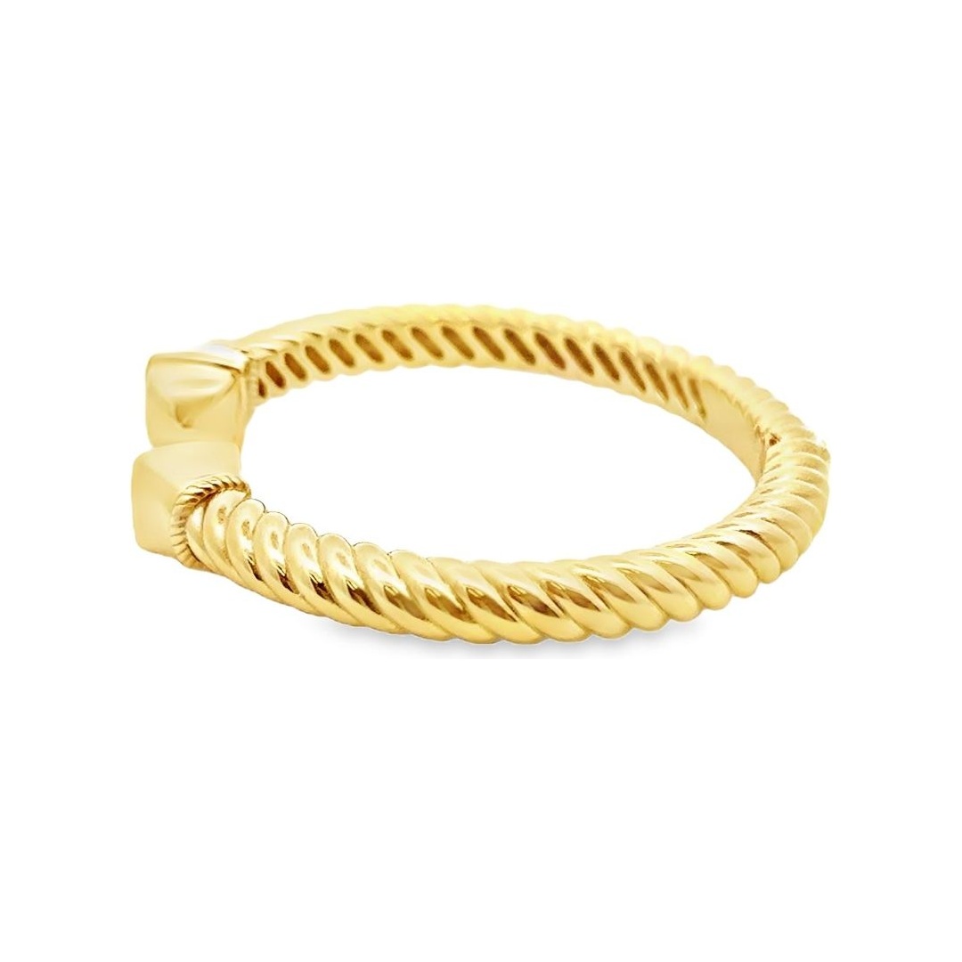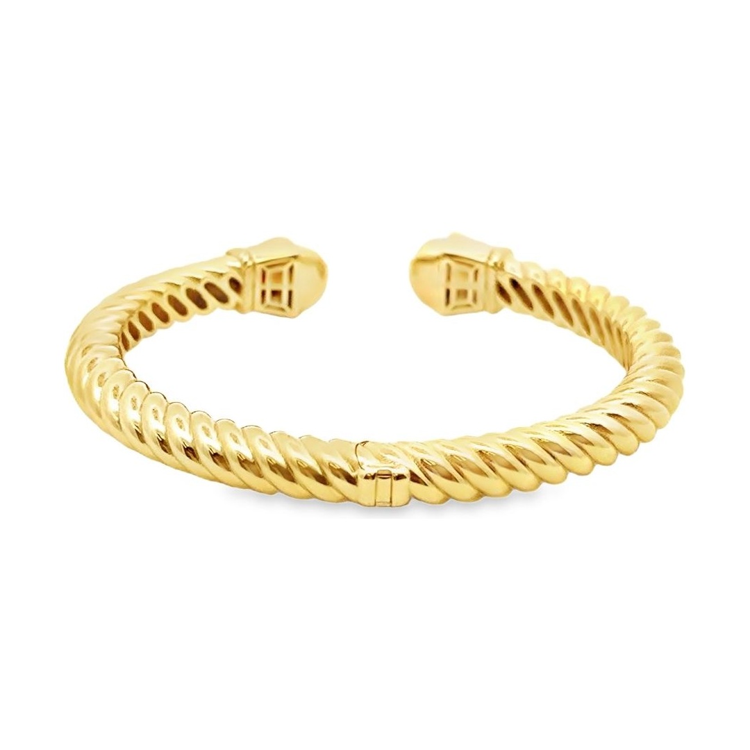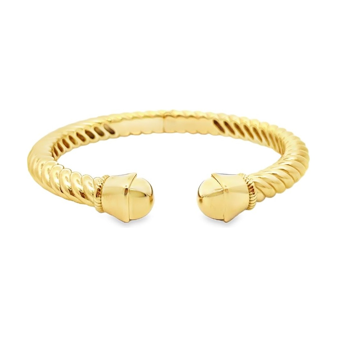 Bold and sophisticated, this 18K yellow gold cuff features a signature twisted cable design accented with sculpted end caps. Its open style allows for easy wear while maintaining a strong masculine profile. A timeless statement of strength and elegance — perfect alone or paired with other Gandy Jewelry pieces.