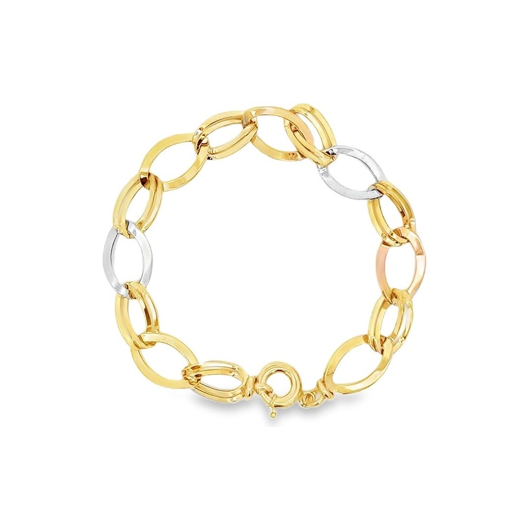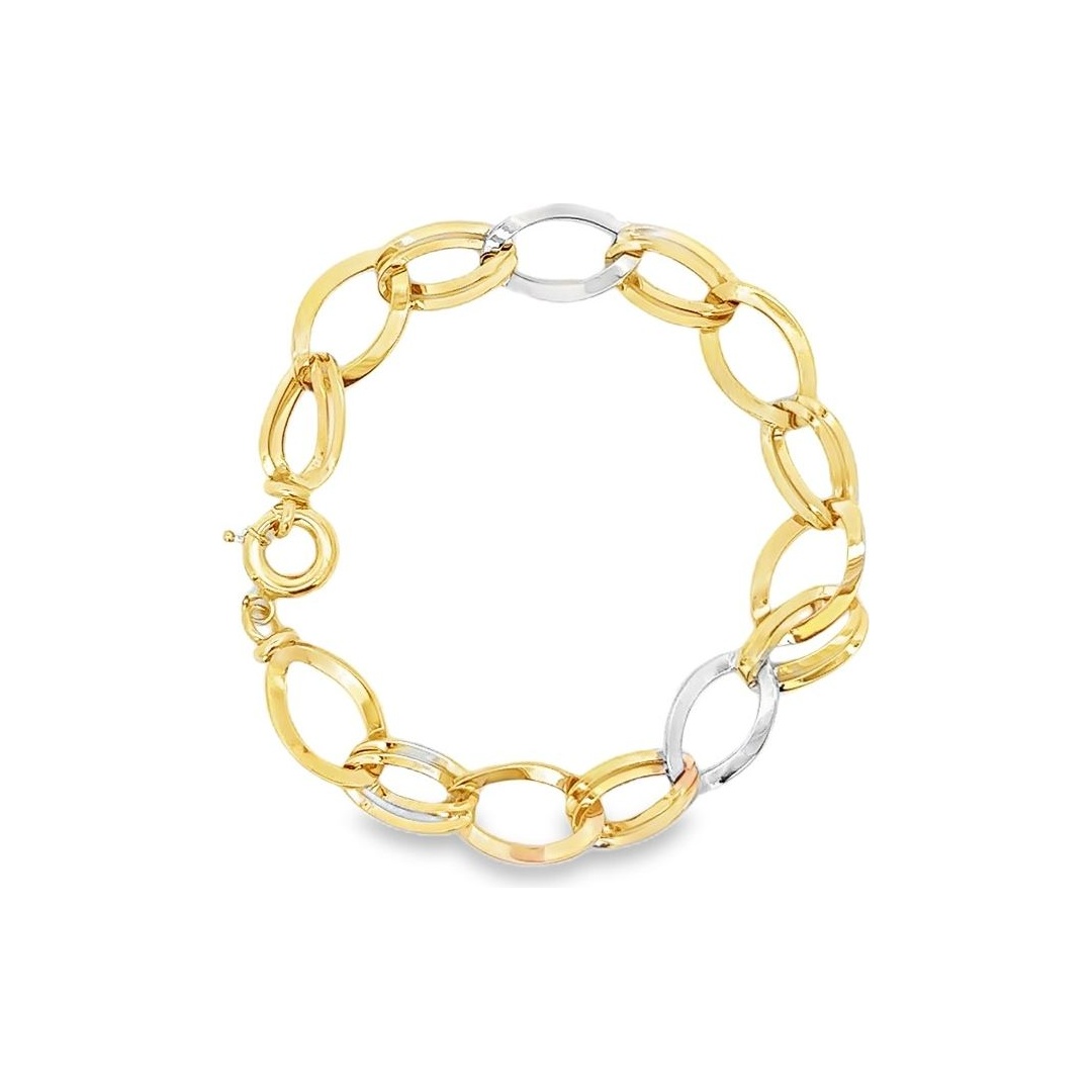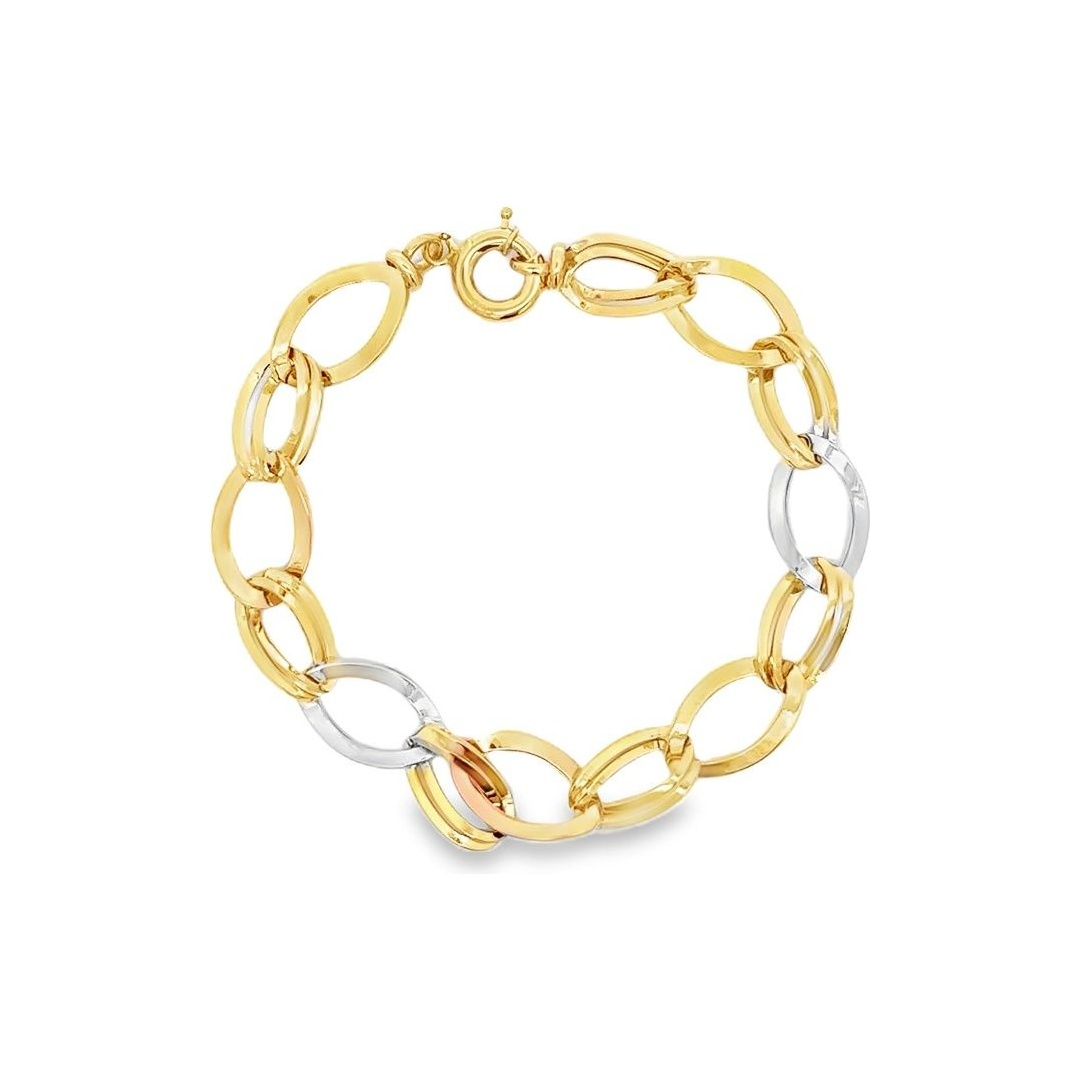 This exquisite bracelet is crafted in 18K yellow, white, and rose gold, creating a harmonious interplay of color and shine. The interlocking infinity-style links symbolize timeless elegance and unity, making it a perfect everyday luxury piece that complements any jewelry combination.