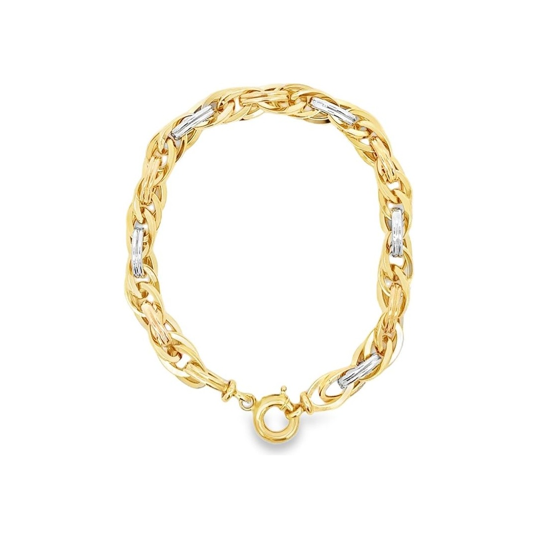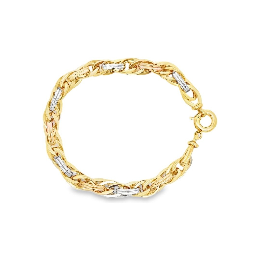 This stunning bracelet showcases a braided rope-style pattern crafted in 18K yellow, white, and rose gold. The interlaced links create a beautiful movement of color and light, symbolizing unity and sophistication. Each segment is meticulously polished to highlight the subtle contrasts between the three gold tones. Perfect for everyday elegance or special occasions.