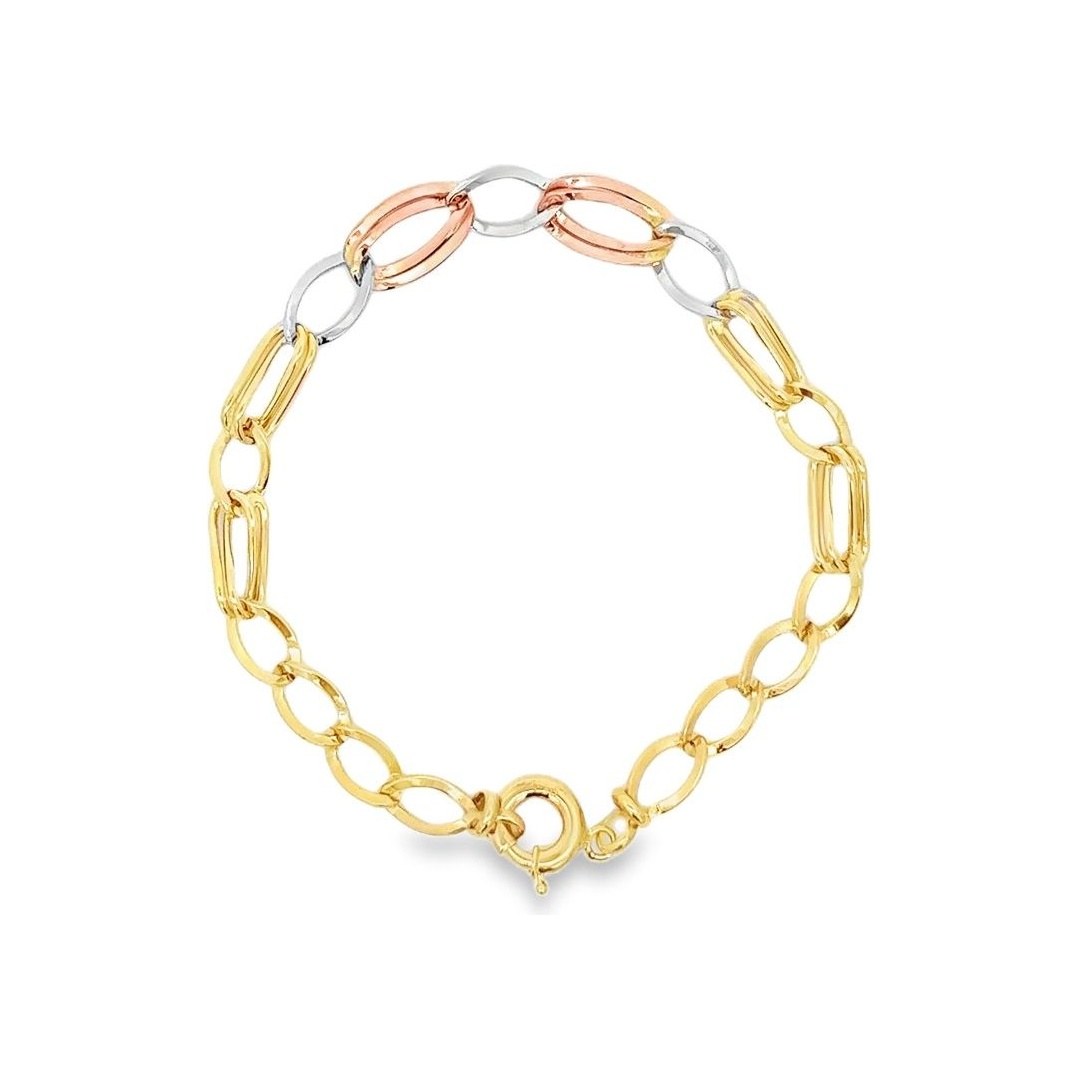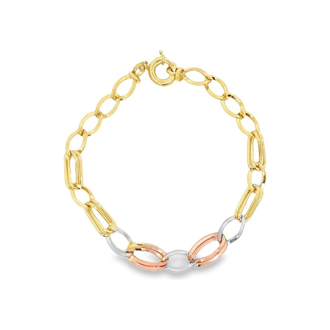 This elegant bracelet is crafted in 18K yellow, white, and rose gold, featuring a refined pattern of interlocking infinity-shaped links. The three-tone combination creates a rich harmony of color, symbolizing unity and balance. Each link flows seamlessly into the next, adding fluid movement and brilliance to the wrist. A timeless design that beautifully complements any jewelry collection.