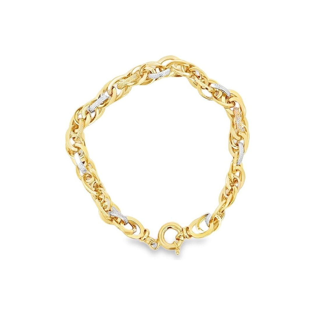 This elegant bracelet combines yellow, white, and rose gold in a beautifully intertwined link design. Each link alternates between polished and textured finishes, creating depth, movement, and a soft interplay of light and color. The intricate craftsmanship highlights the contrast between tones, giving it a luxurious yet timeless character. Designed for those who appreciate refined artistry, this bracelet transitions seamlessly from sophisticated daywear to elevated evening elegance.