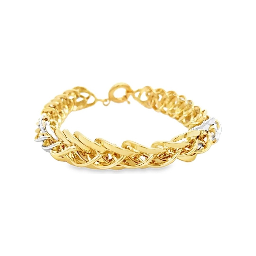 This elegant bracelet showcases a woven pattern of interlocking links in yellow and white gold, skillfully crafted to highlight a refined contrast between warm and cool tones. The intricate weave creates a sense of movement and texture, while the high-polish finish enhances its luxurious luster. Crafted in solid 18K gold, this bracelet combines strength with sophistication, offering a versatile design that transitions effortlessly from daywear to evening elegance. A timeless statement piece for those who appreciate both craftsmanship and classic beauty