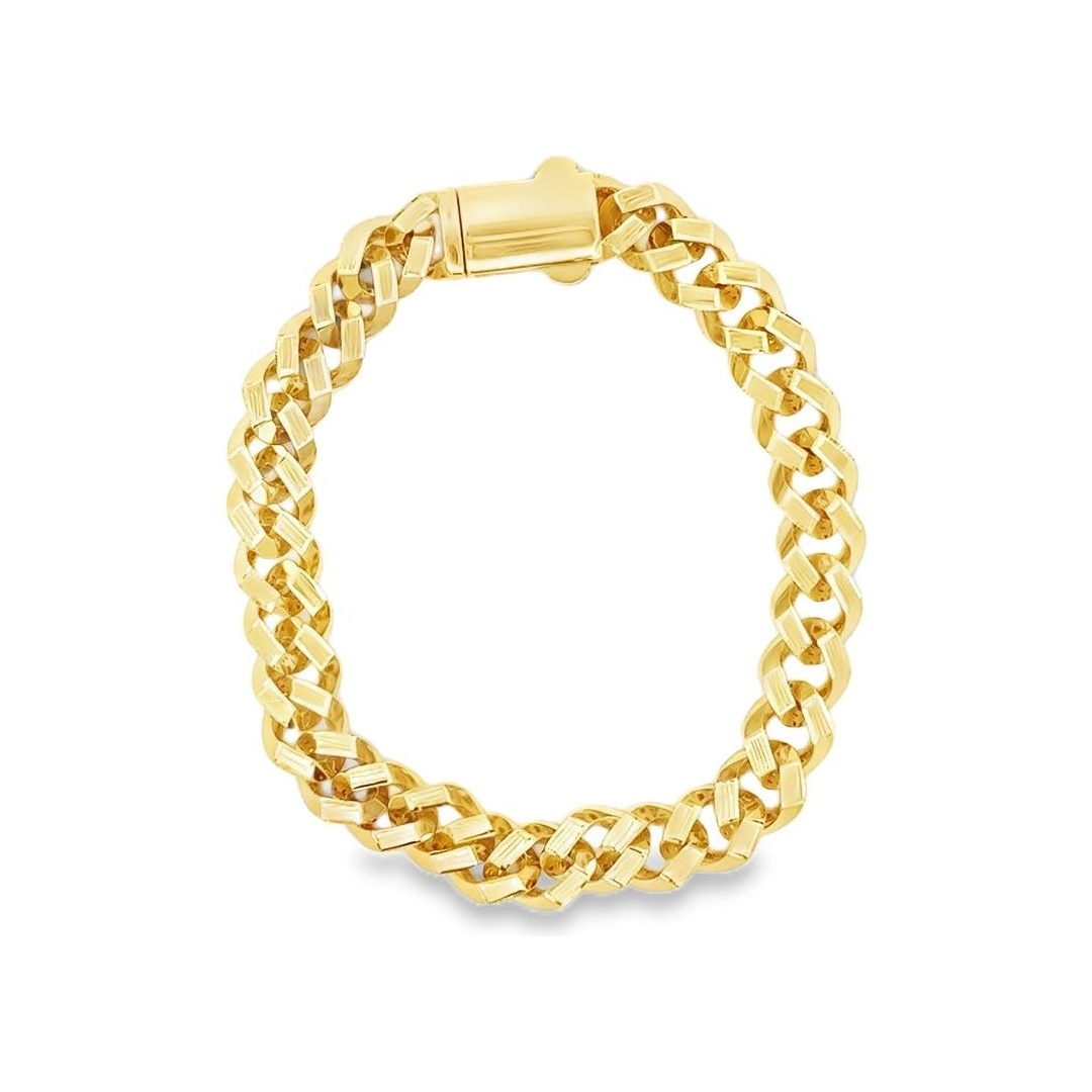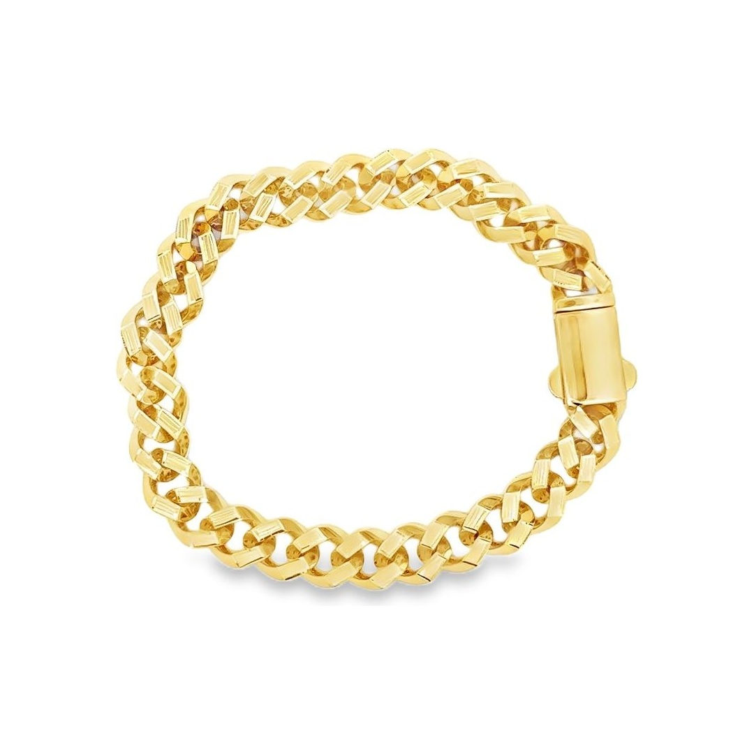 This stunning bracelet is crafted entirely in 18K yellow gold, featuring a classic Cuban link design that exudes strength and sophistication. Each solid, tightly interlocking link is expertly polished to achieve a brilliant, mirror-like finish, reflecting light beautifully from every angle. The bracelet is secured with a durable box clasp and safety latch, ensuring both elegance and peace of mind during wear.