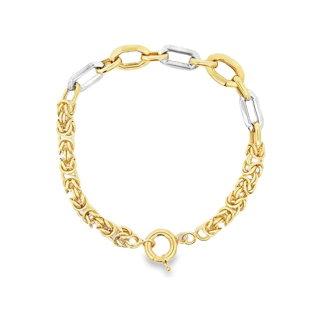 The alternating patterns showcase expert craftsmanship — the Byzantine segments add texture and complexity, while the elongated links offer a smooth, elegant rhythm. Finished with a secure spring ring clasp, this bracelet perfectly blends classic artistry and modern sophistication.