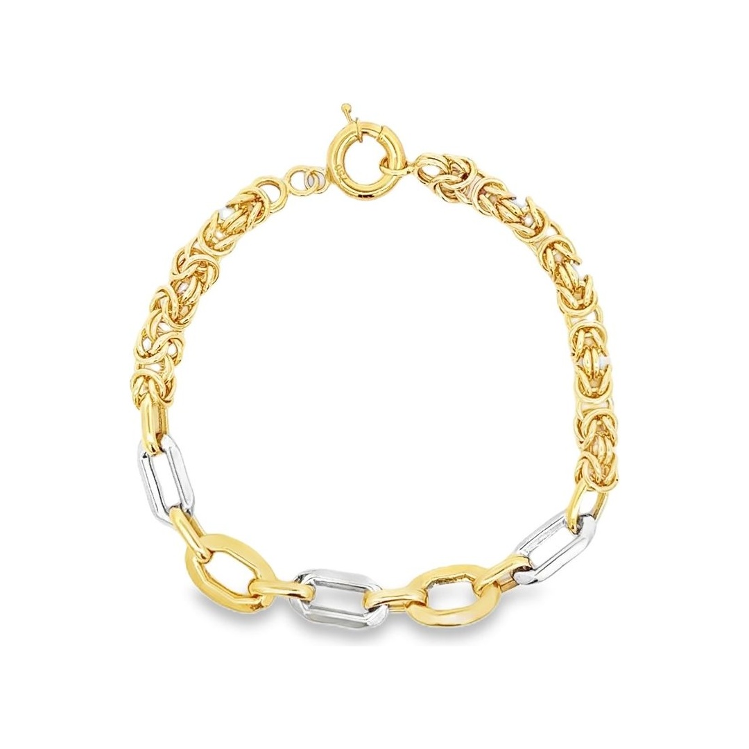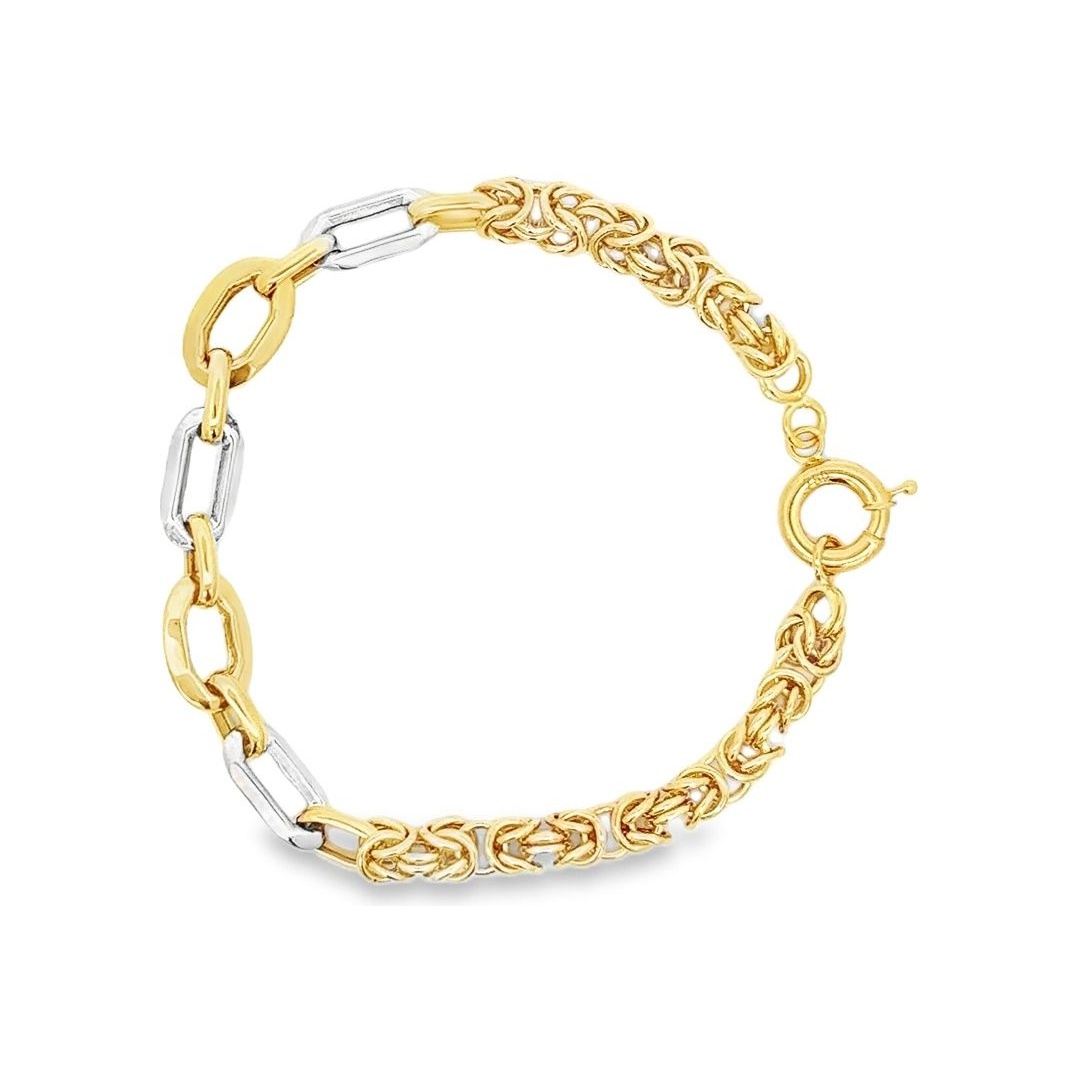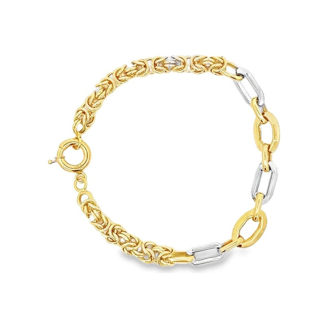 This distinctive bracelet features a striking combination of intricate Byzantine links and elongated polished links, crafted in luxurious 18K two-tone gold. The warm yellow gold contrasts beautifully with subtle white gold accents, creating a refined yet bold visual balance.