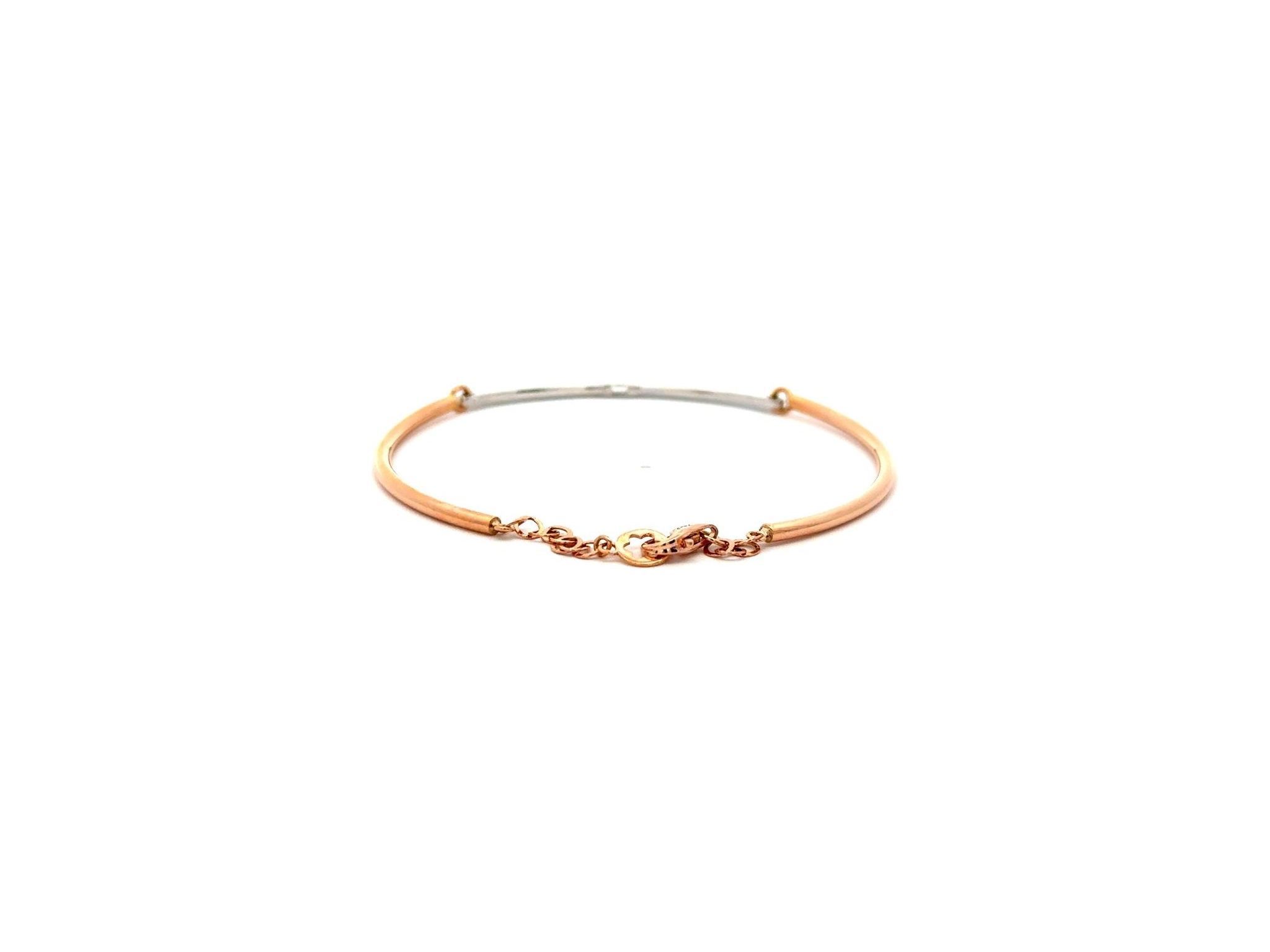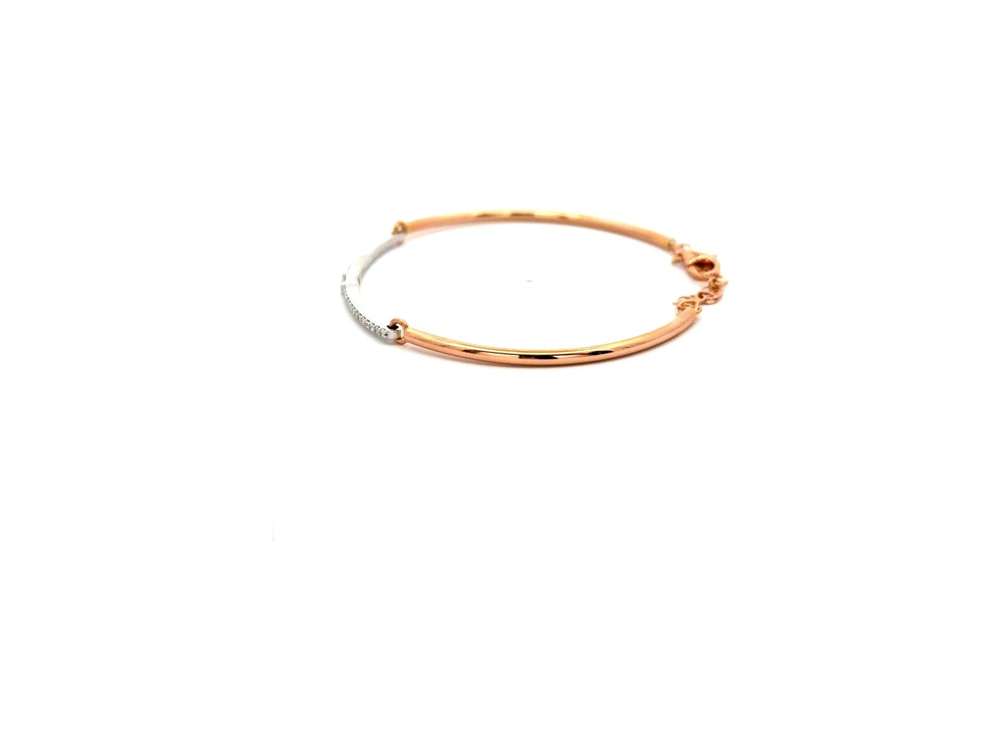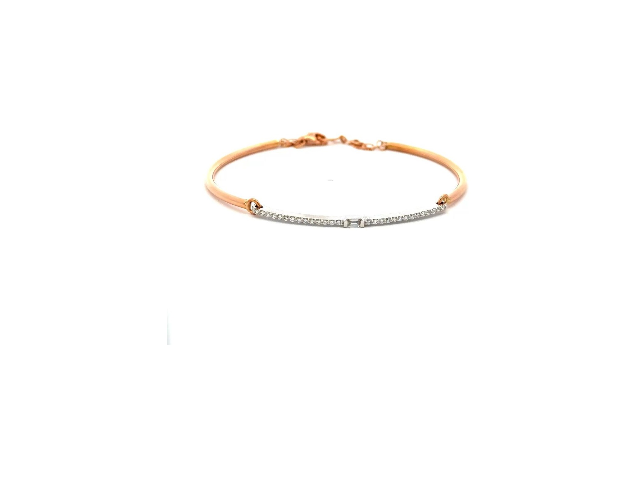 18K White and Rose Gold Bangle Bracelet with a Natural Baguette Diamond Center and Round Diamonds on Both Sides