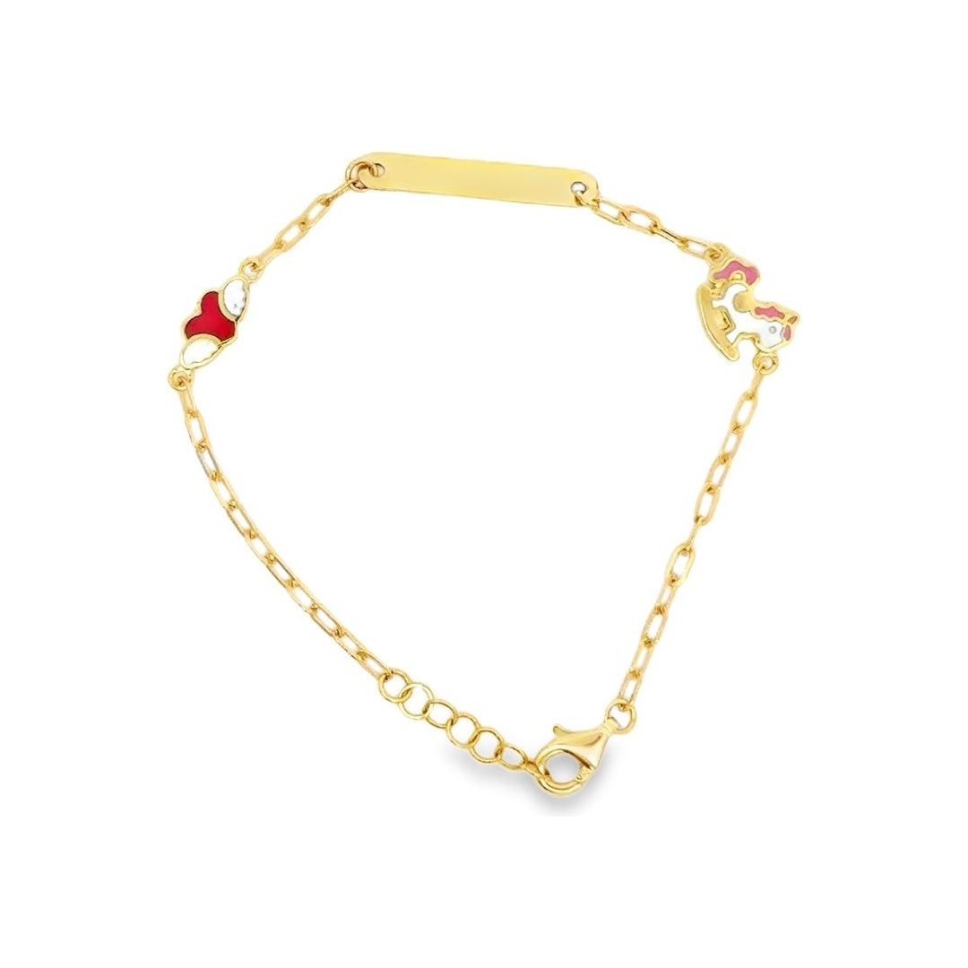 18K Yellow Gold Baby ID Bracelet with Enamel Rocking Horse and Winged Heart Charms