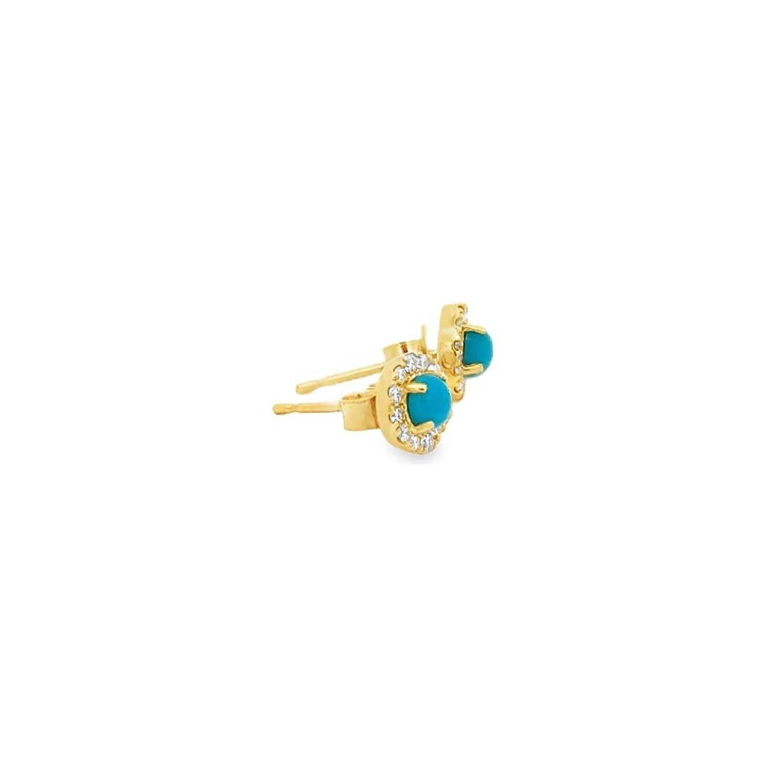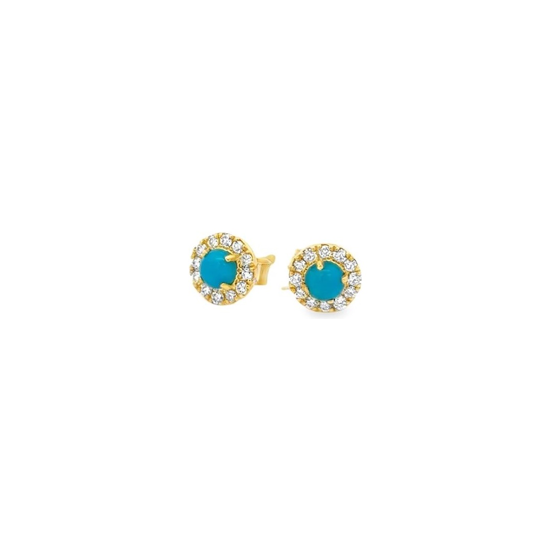 A true expression of refined color and timeless design, these Gandy Jewelry earrings feature round-shaped natural turquoise stones framed by a delicate halo of natural diamonds, all crafted in 18K yellow gold. Their serene blue hue evokes sophistication with a touch of Mediterranean charm.