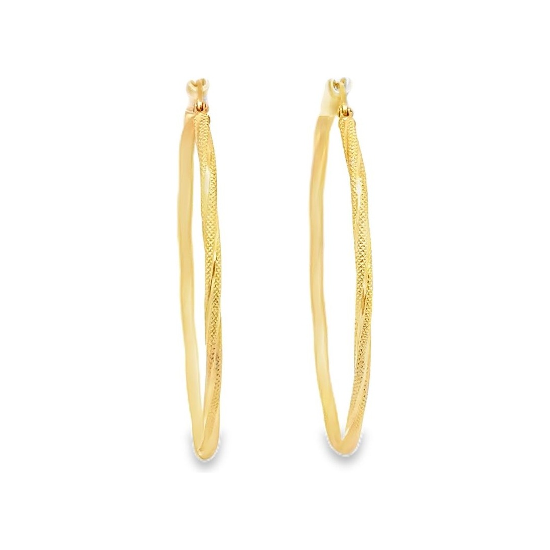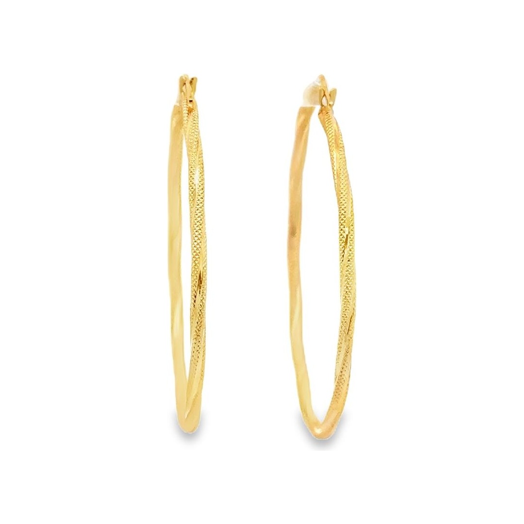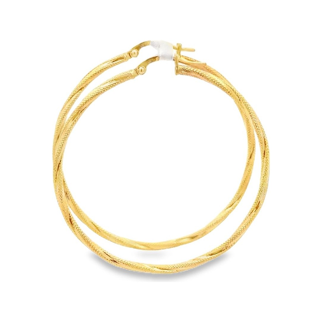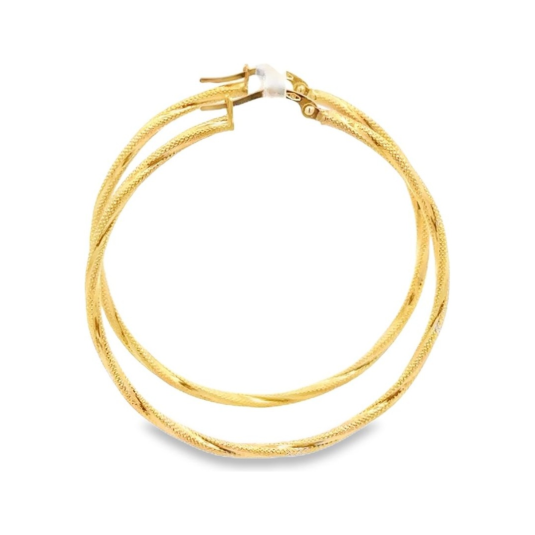 These elegant round hoop earrings are crafted in 18K yellow gold and feature a beautiful textured finish that adds depth, sparkle, and a luxurious feel.