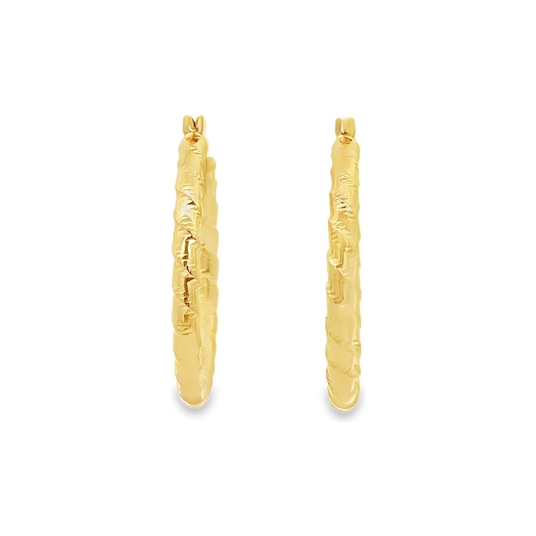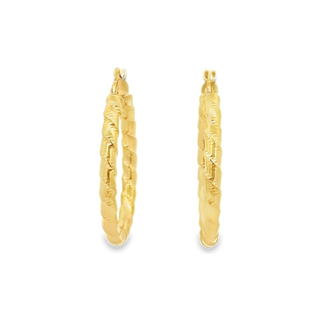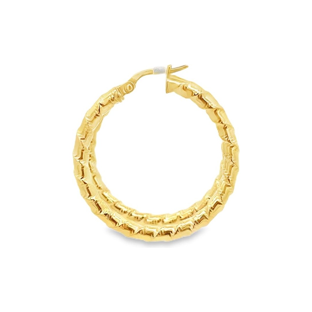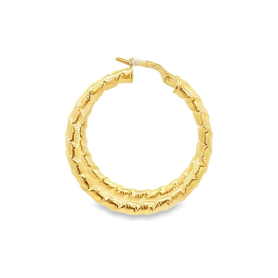 These stunning hoop earrings are crafted in radiant 18K yellow gold, featuring an intricate chevron-textured pattern all around the circumference. The bold, zig-zag detailing adds depth, sparkle, and a modern twist to a classic hoop silhouette.