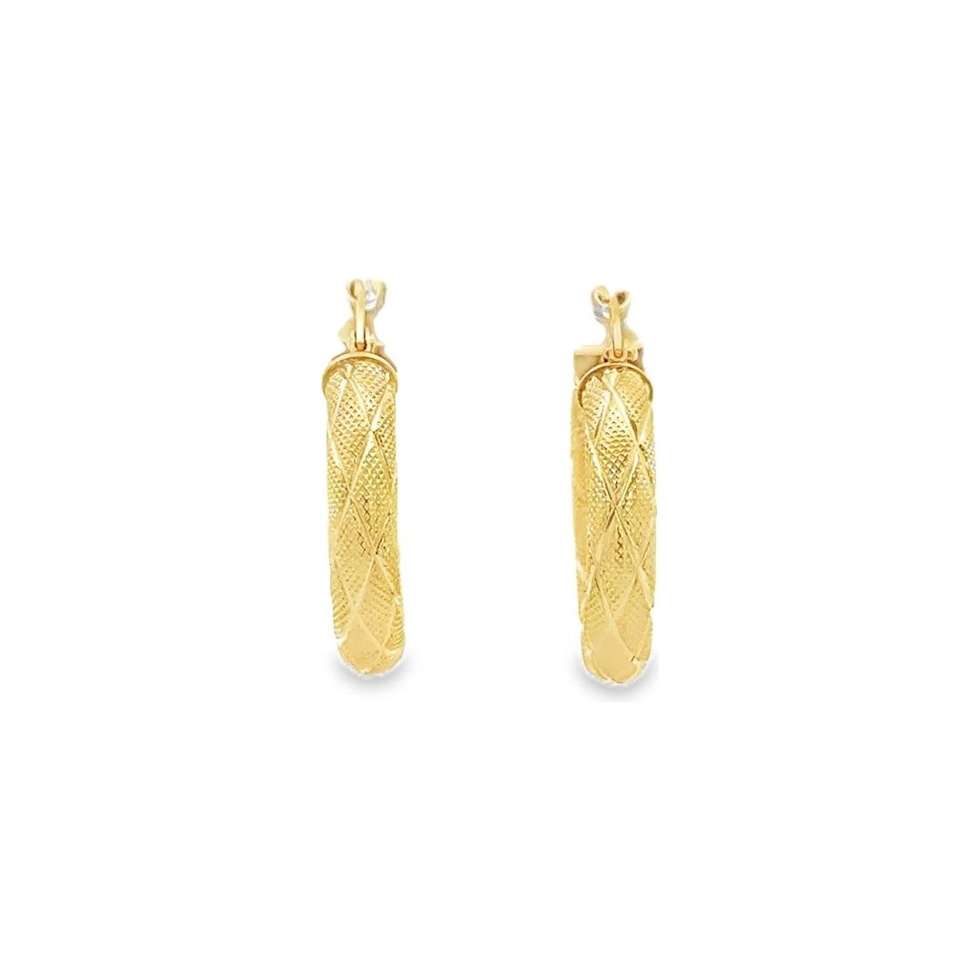 These elegant hoops feature a detailed cross-hatch design created with fine diamond-cut engraving, giving them a luxurious sparkle from every angle. Crafted in 18K yellow gold, the earrings have a classic rounded silhouette with a bold, traditional look.