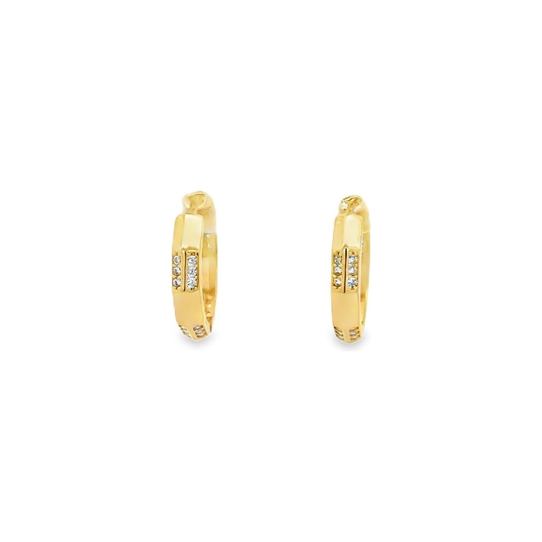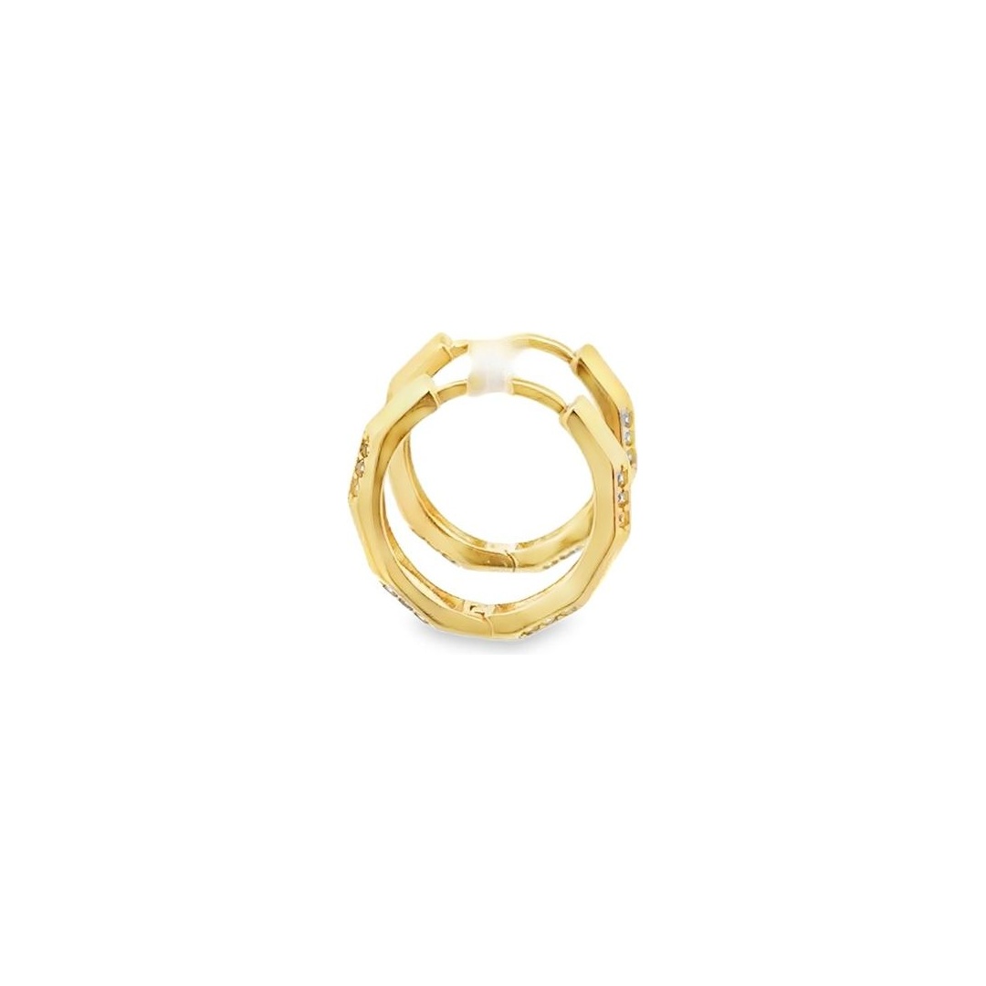 These 18K yellow gold hoops feature a bold geometric design enhanced by a row of sparkling synthetic stones set at the front. The angular edges and polished finish give the earrings a modern, structured look, while the stones add a touch of refined brilliance without overpowering the design.