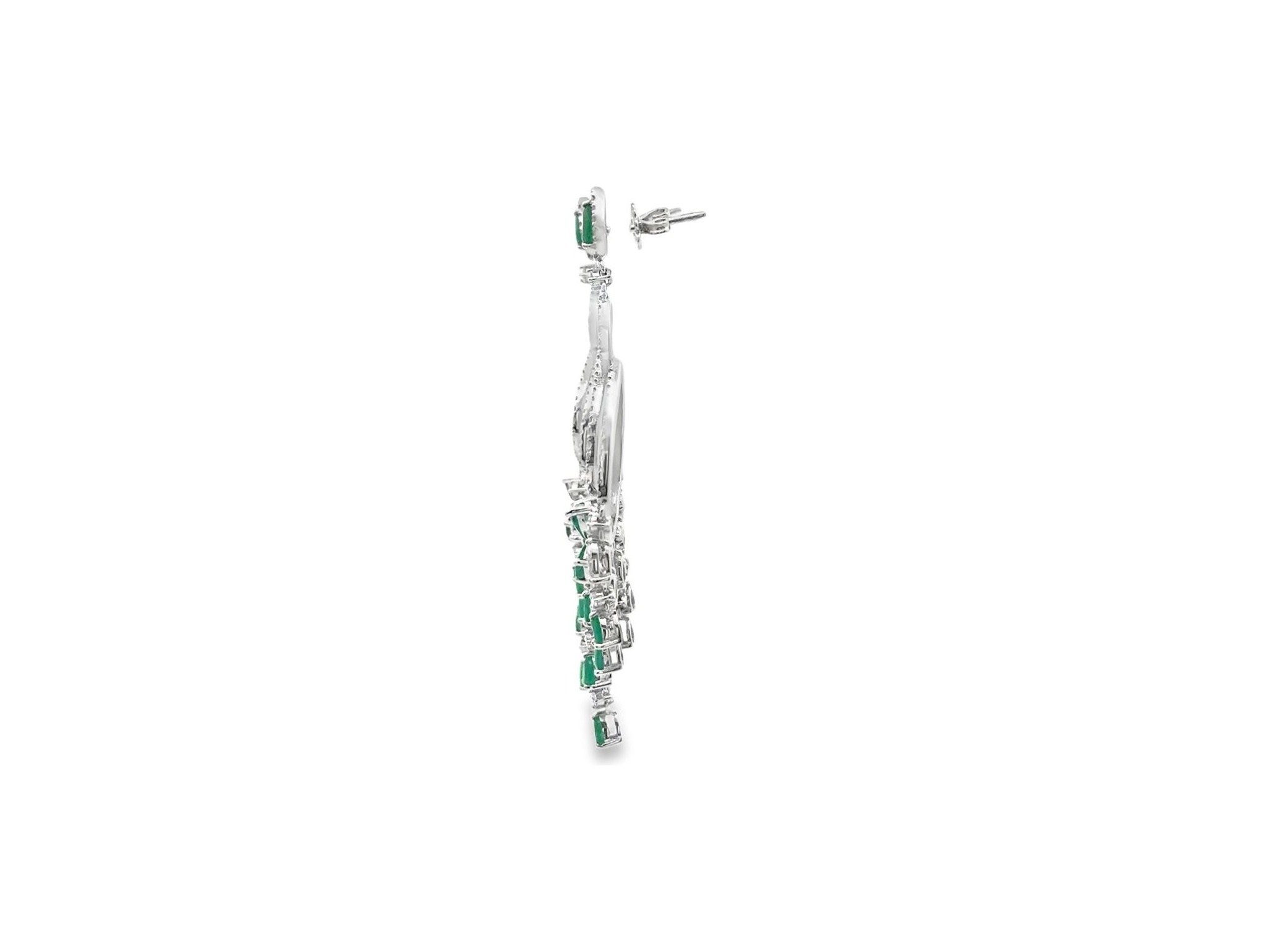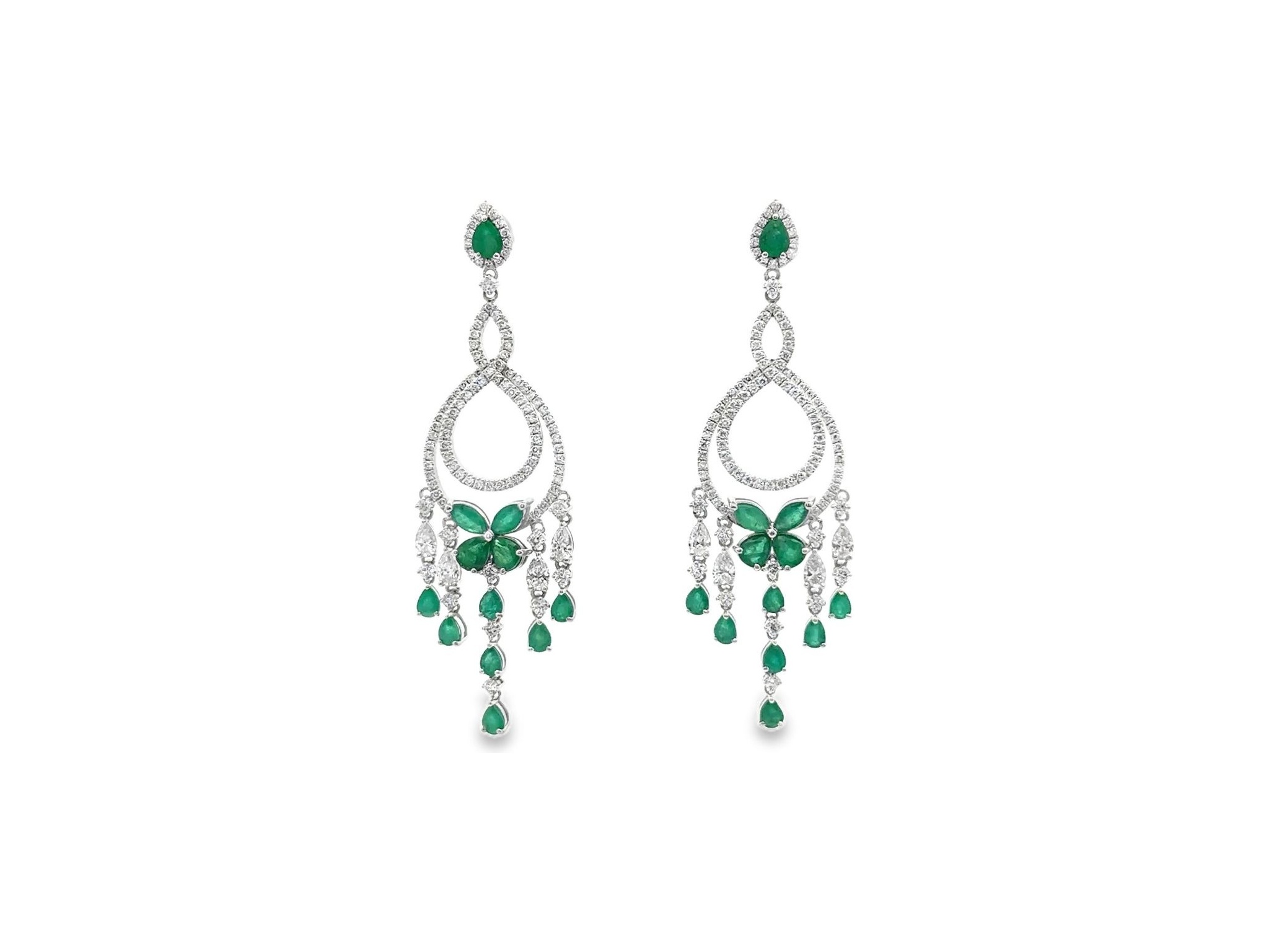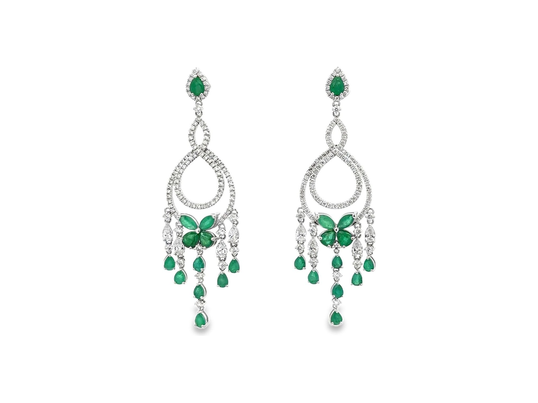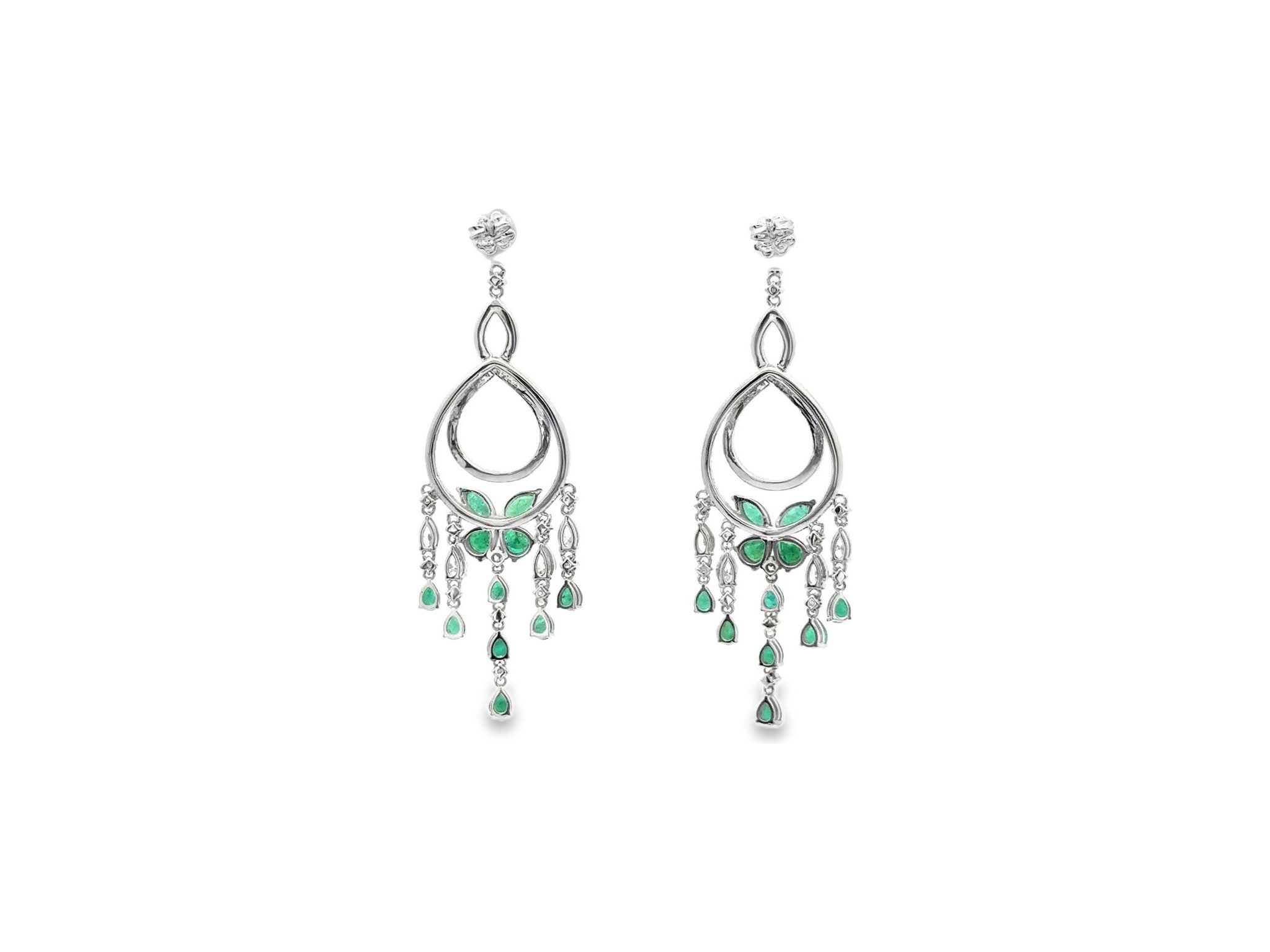 18K White Gold Chandelier Earrings with Natural Round Diamonds, Pear-shaped Diamonds and Emeralds