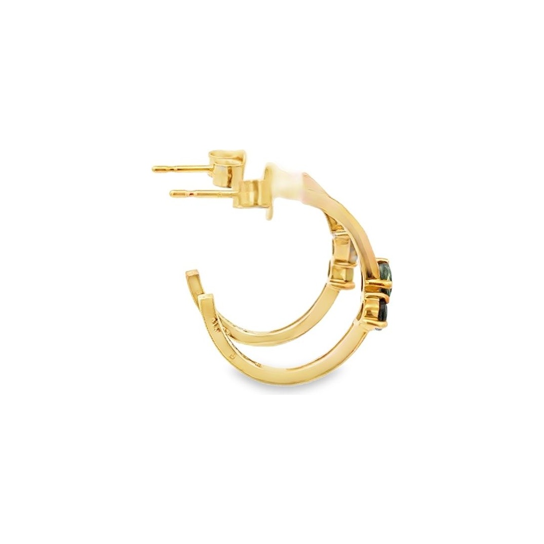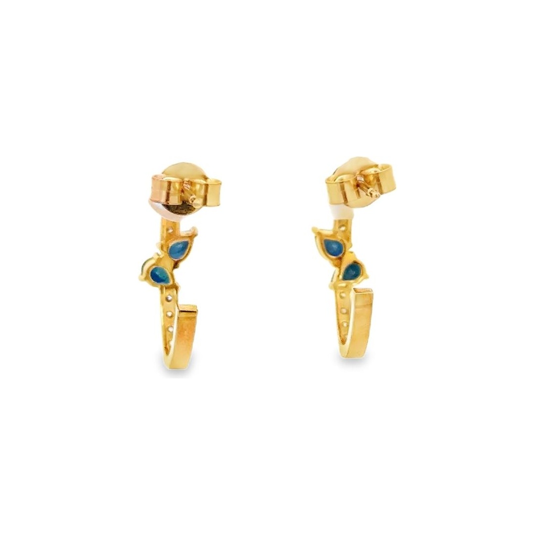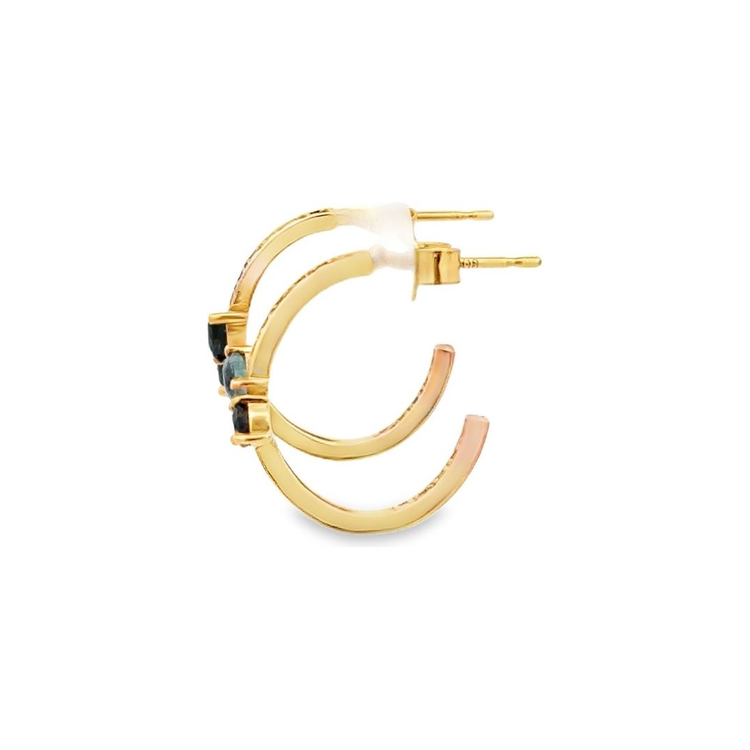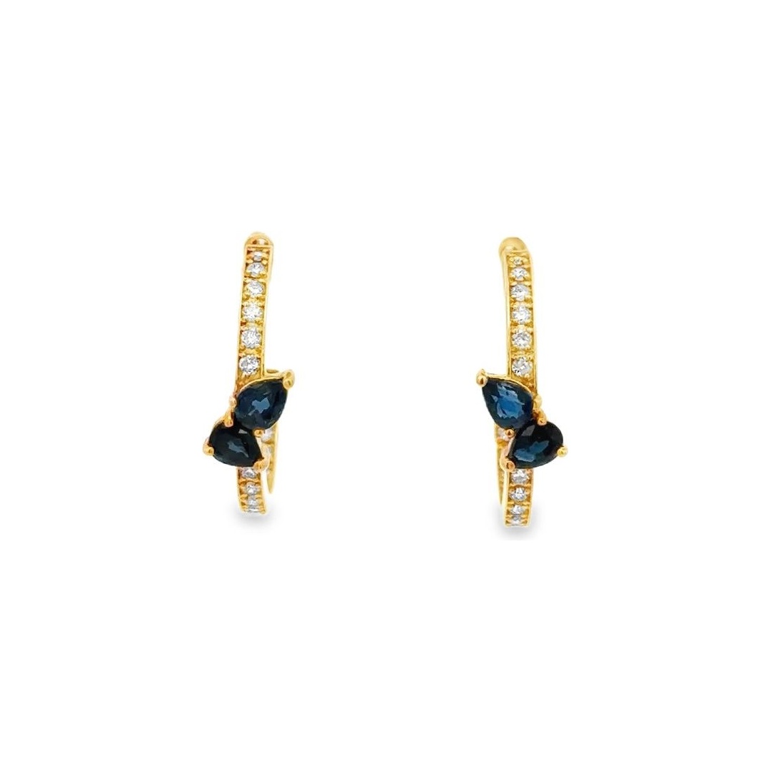 These modern 18K yellow gold sapphire hoop earrings feature natural pear-cut blue sapphires paired with pavé-set natural diamonds for a luxurious sparkle. A contemporary open-hoop design that adds elegance and color to everyday and evening looks