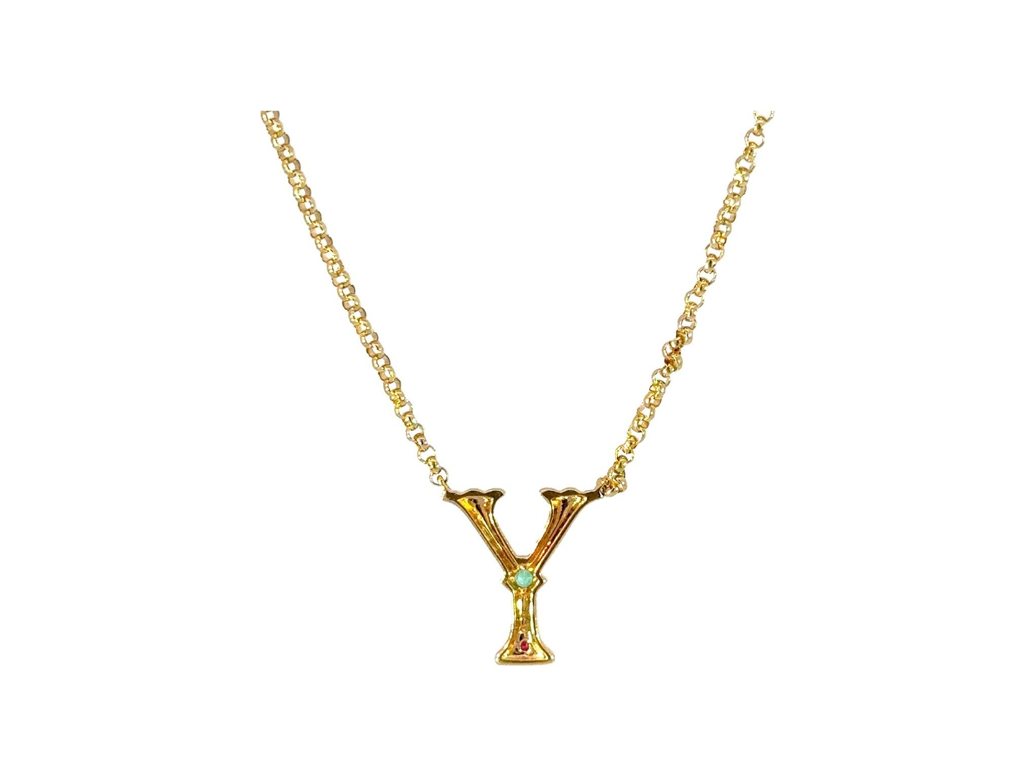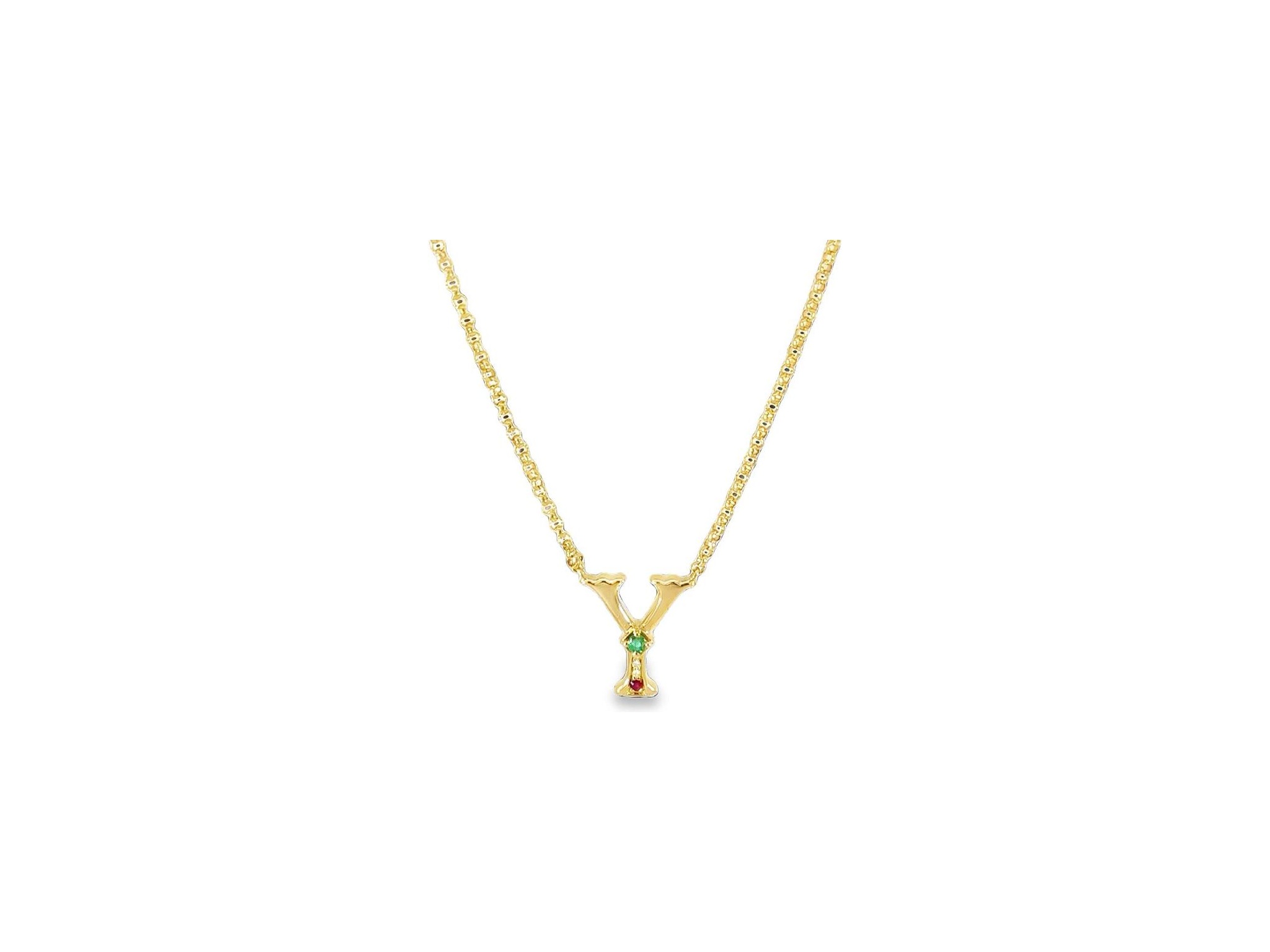 18k yellow gold Y neckalce with natural diamonds, emerald and ruby