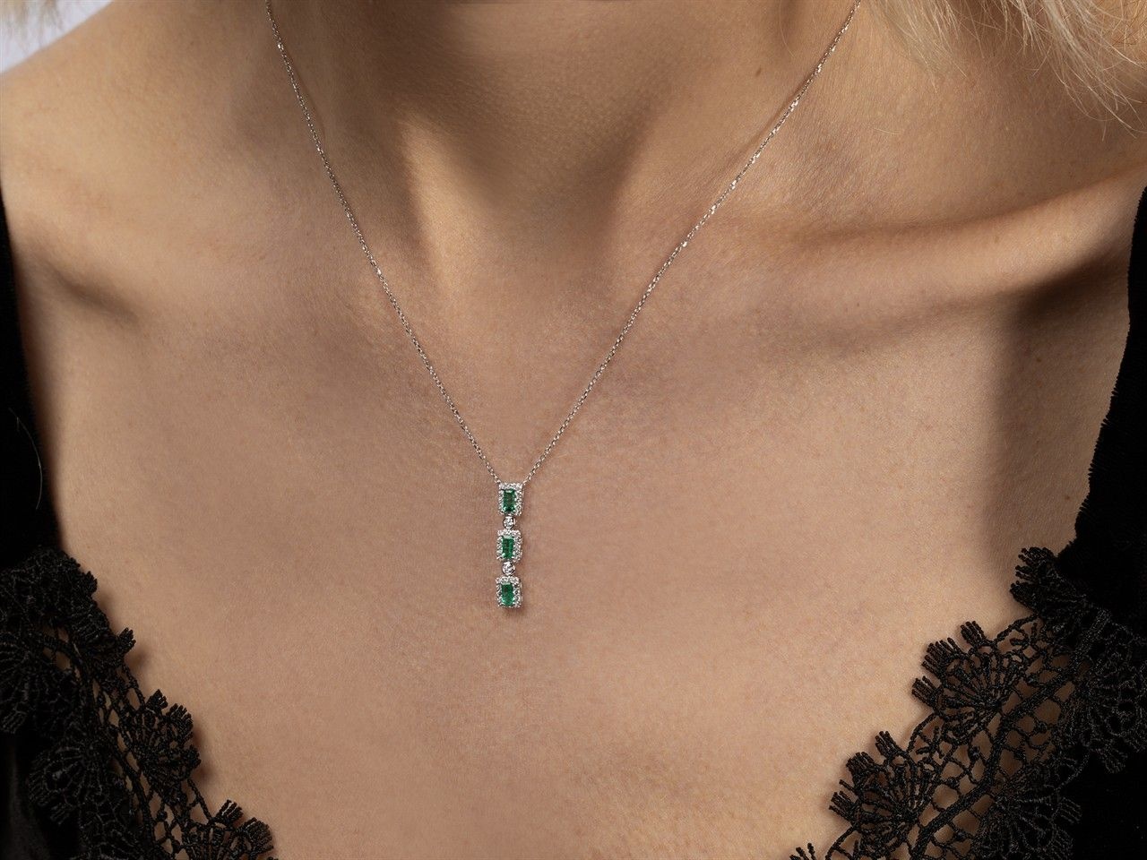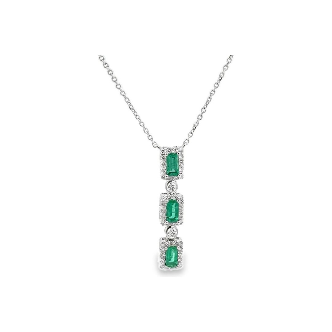 A glamorous cascading trio of emeralds, each framed with radiant diamonds for maximum visual impact.