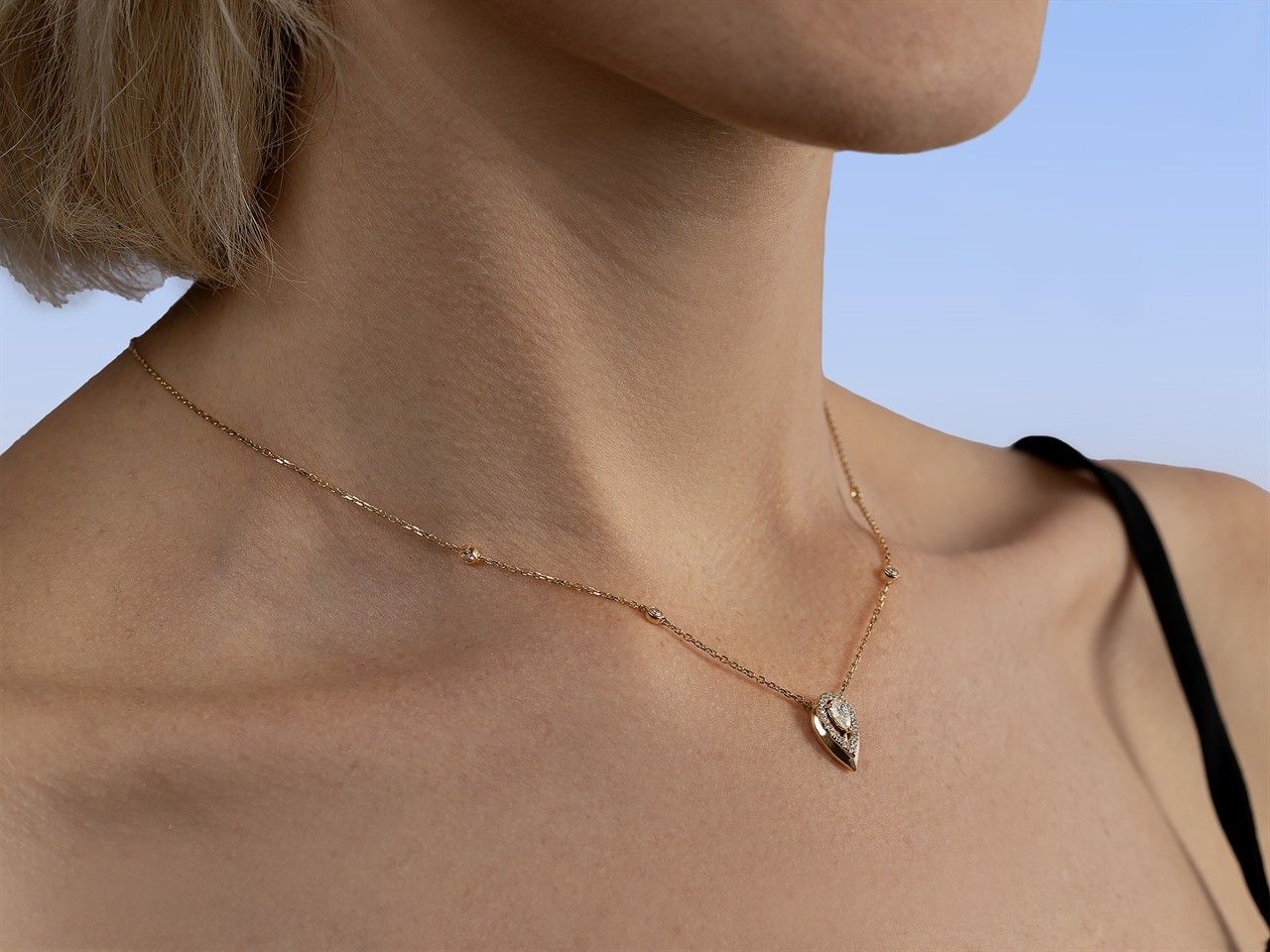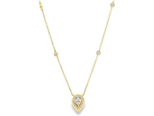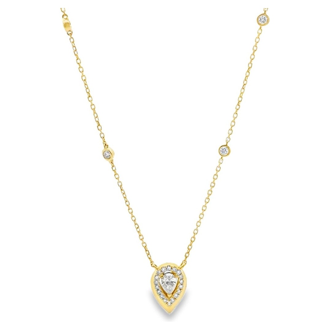 A contemporary elegance designed in 18K solid yellow gold and accented with natural round diamonds throughout the chain. The teardrop pendant features a double diamond halo, creating maximum brilliance and a gracefully elongated silhouette — a luxurious essential for everyday sparkle.