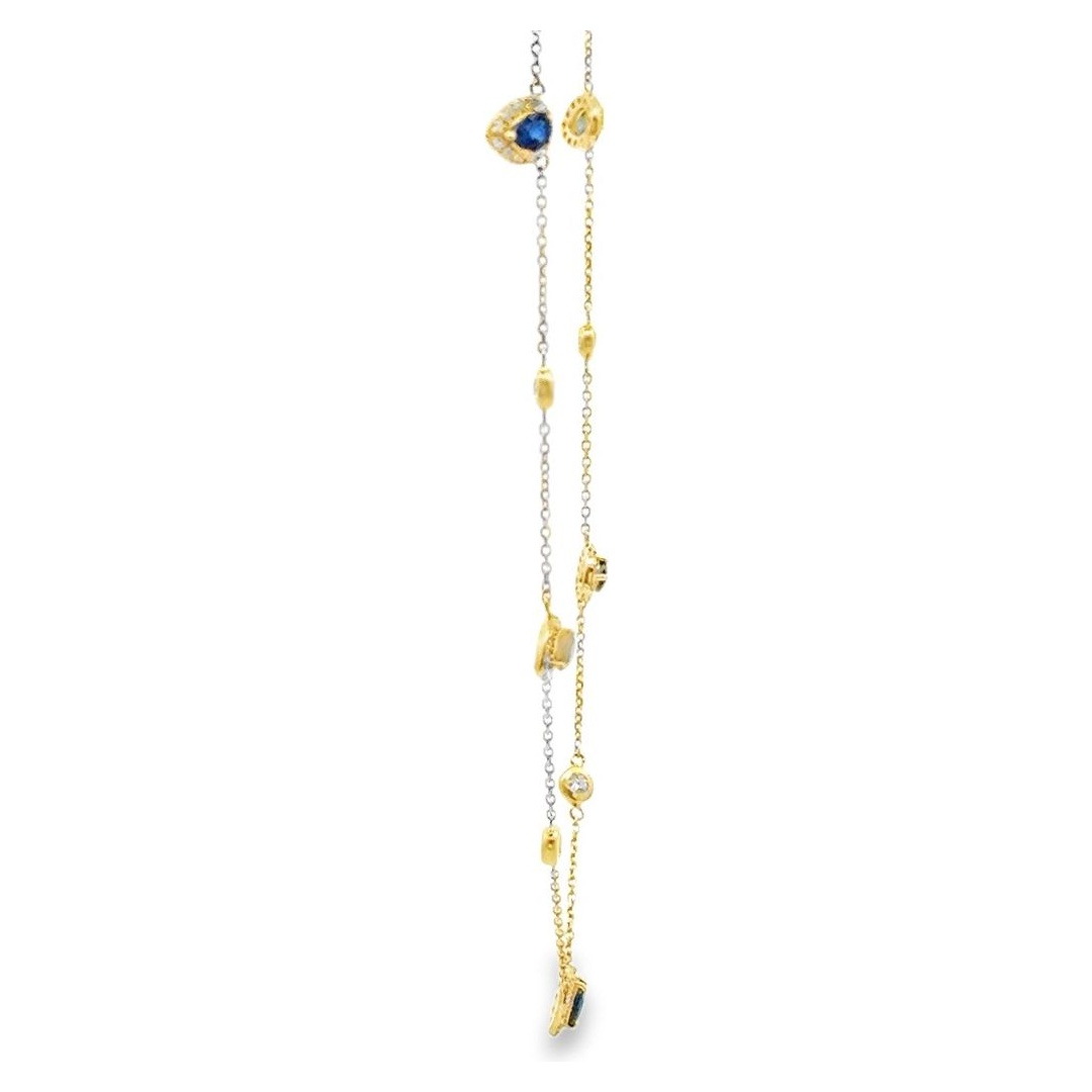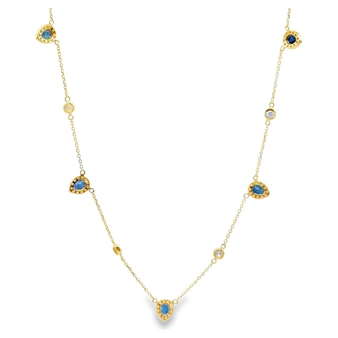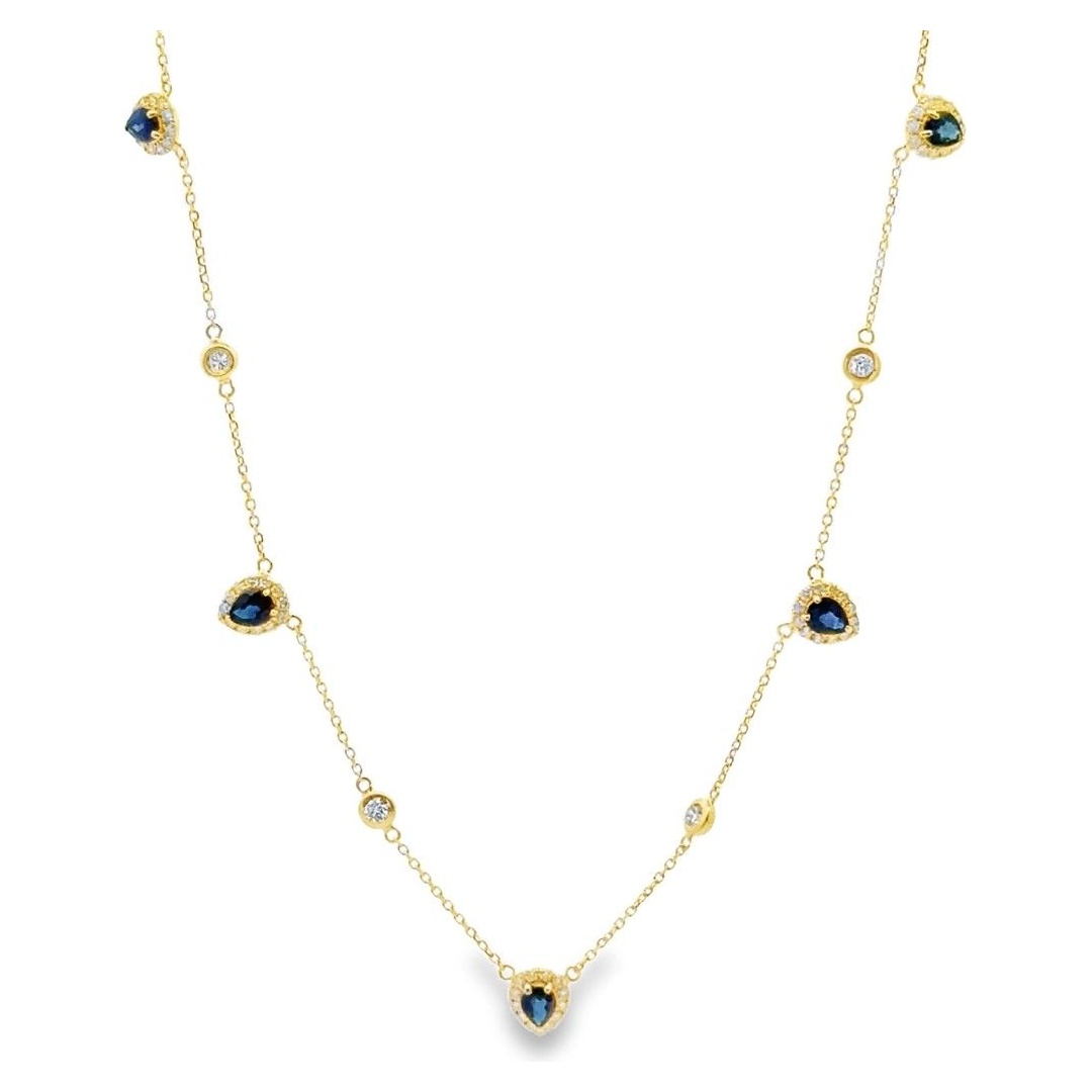 This sophisticated station necklace showcases vibrant natural blue sapphires, each surrounded by a shimmering halo of natural diamonds, complemented by bezel-set diamonds along the chain. Expertly crafted in 18K yellow gold, it offers a luxurious blend of elegance and color, ideal for both everyday wear and celebration styling.