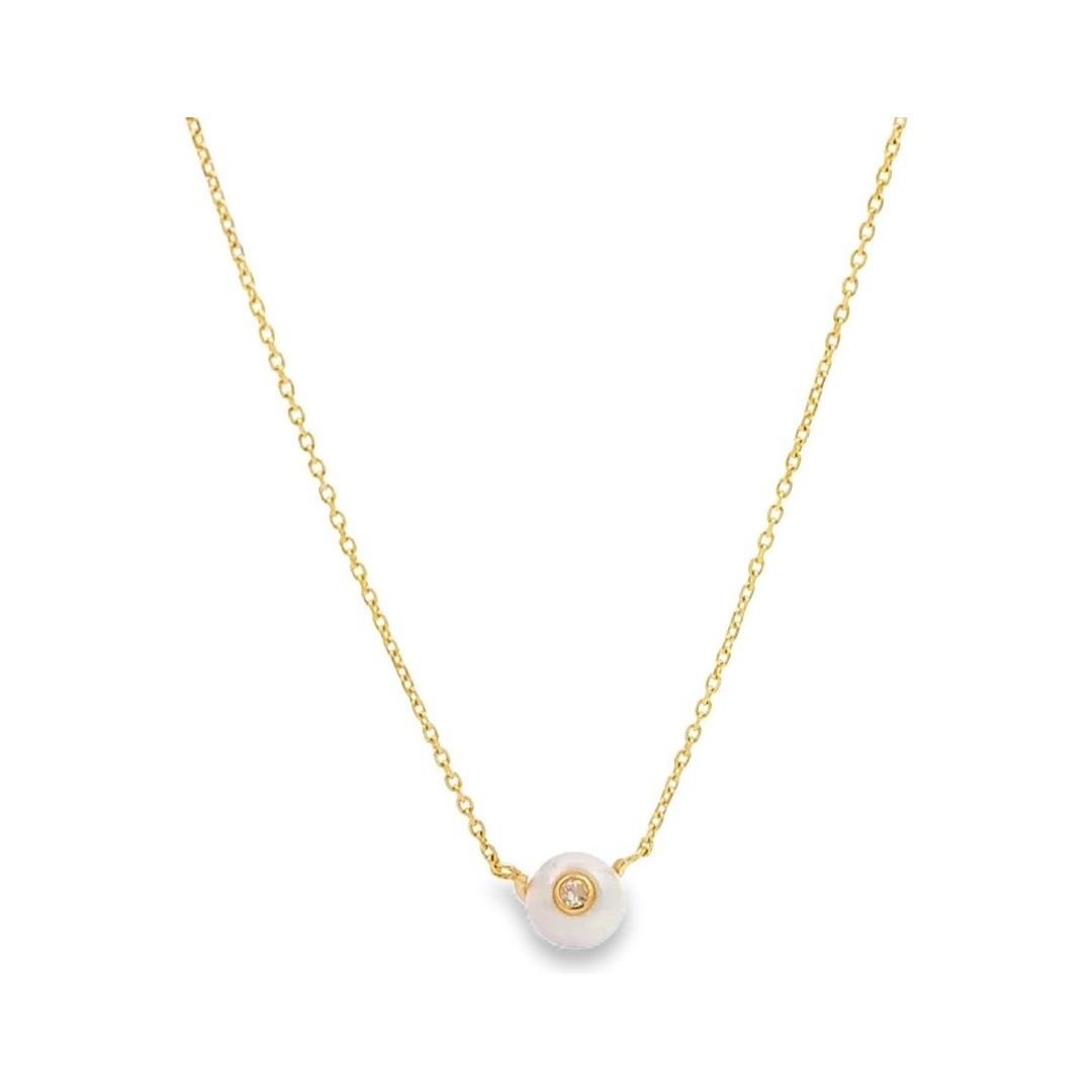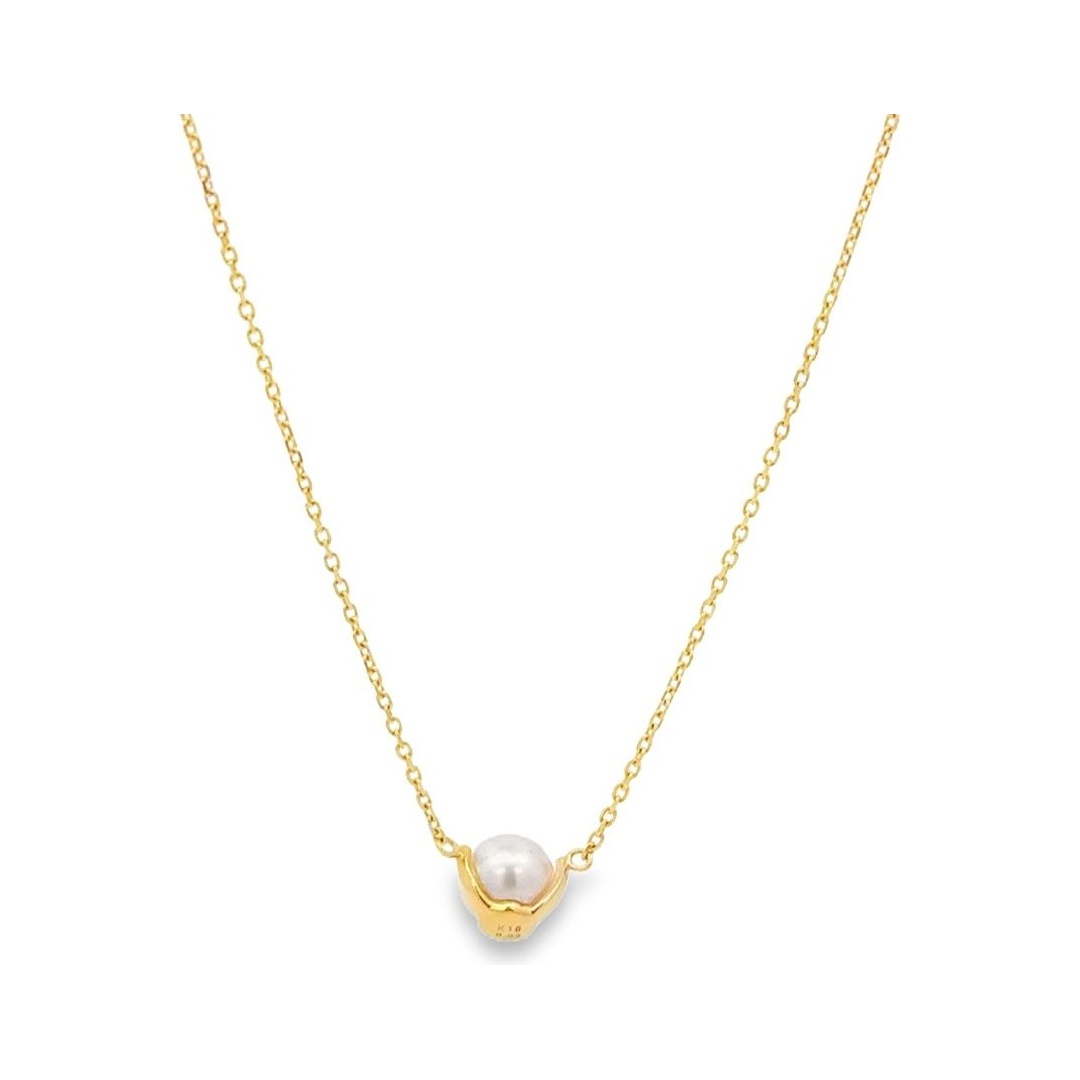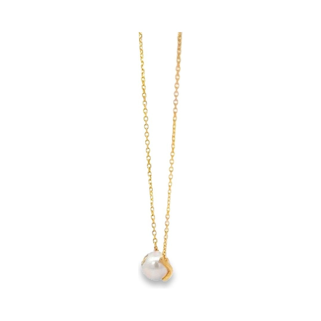 Refined and timeless, this necklace features a radiant white cultured pearl paired with a bezel-set natural diamond, hand-set in 18K solid yellow gold. The design delivers a gentle touch of luxury that pairs with every style — from bridal elegance to everyday chic.