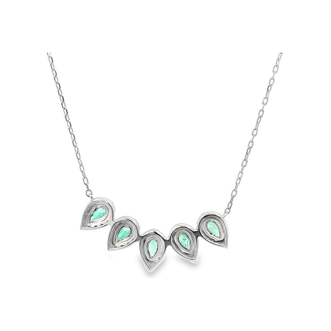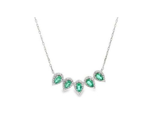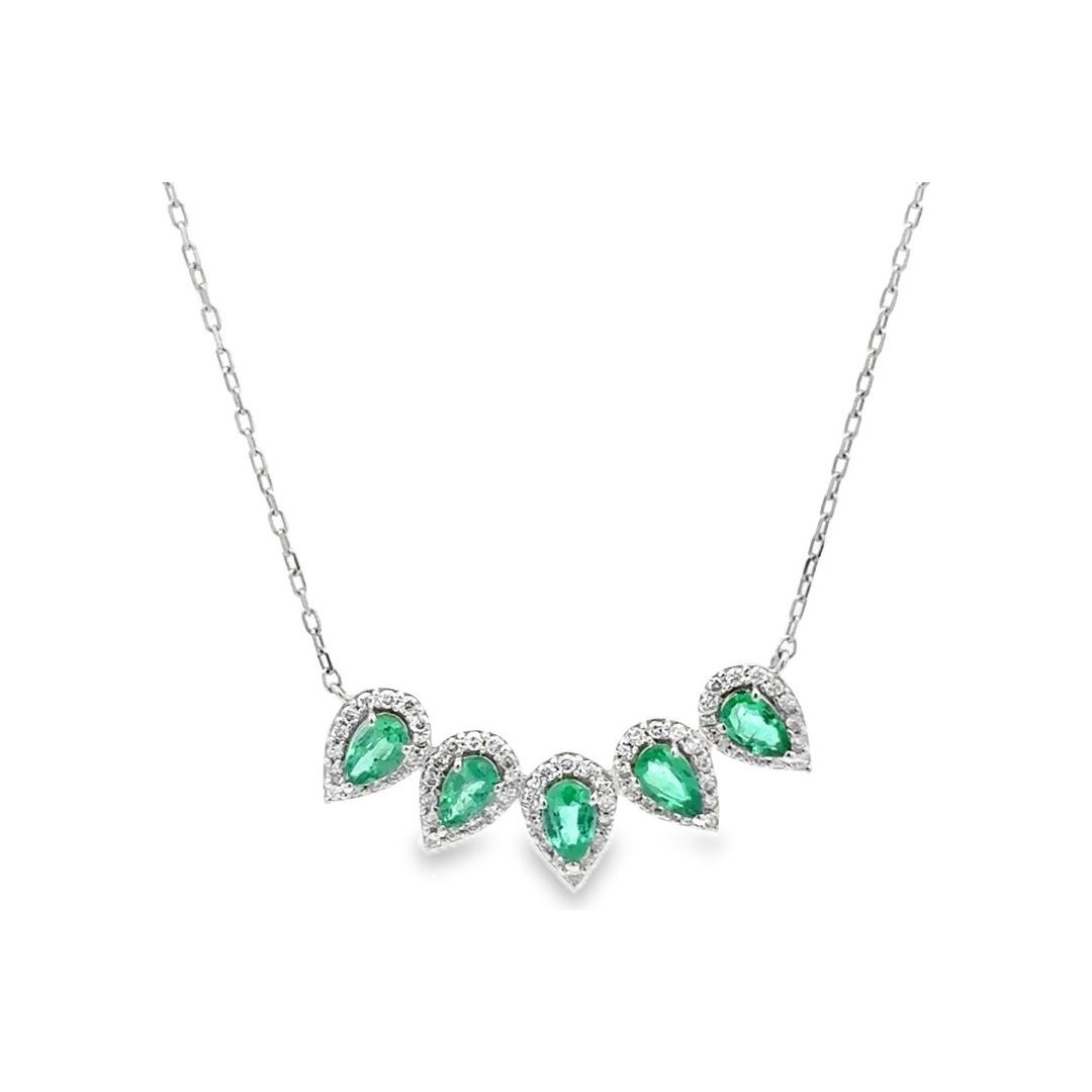 Five pear-cut natural emeralds form a beautifully balanced cluster, each enhanced by a halo of brilliant natural diamonds. Designed in 18K white gold, this striking necklace offers a distinctive blend of bold color and refined sparkle.