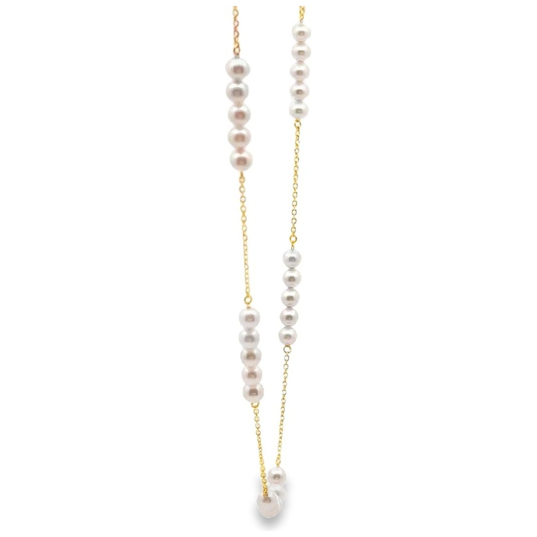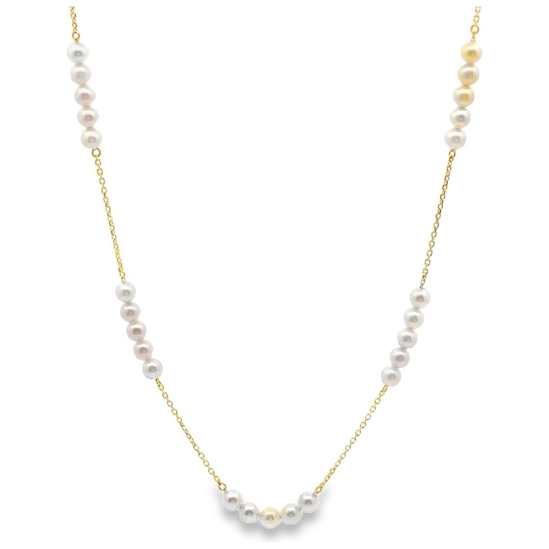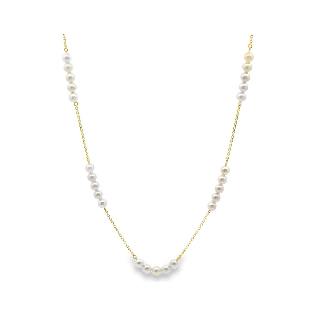 Timeless elegance meets subtle sparkle — this graceful necklace features lustrous white pearls arranged along a delicate 18K yellow gold chain, accented by natural diamond details. A versatile piece ideal for both everyday and special occasions.