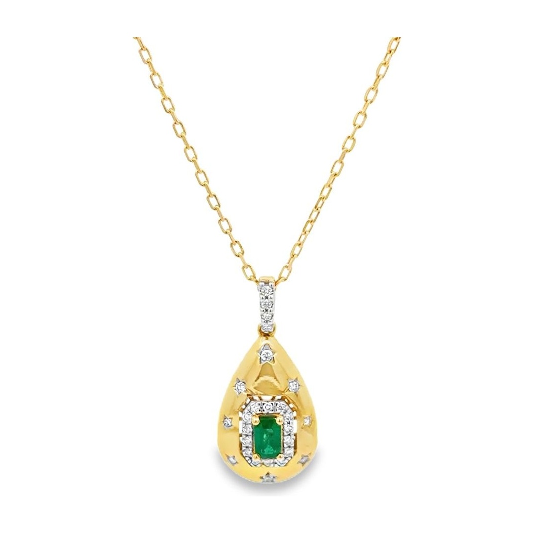 A timeless teardrop silhouette highlights a natural emerald-cut emerald, encircled by shimmering natural diamonds. Crafted in 18K yellow gold, this pendant radiates luxury, making it a standout centerpiece for any jewelry collection.