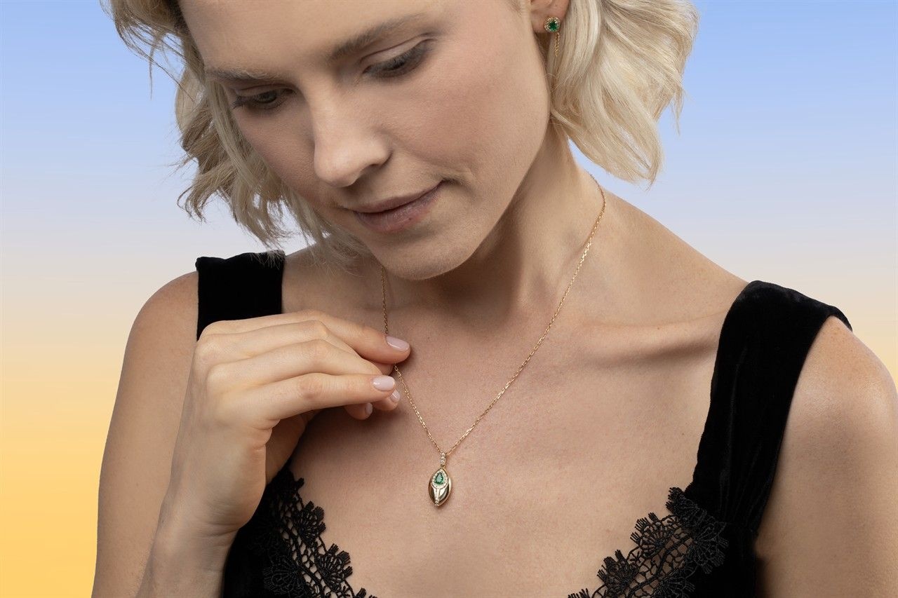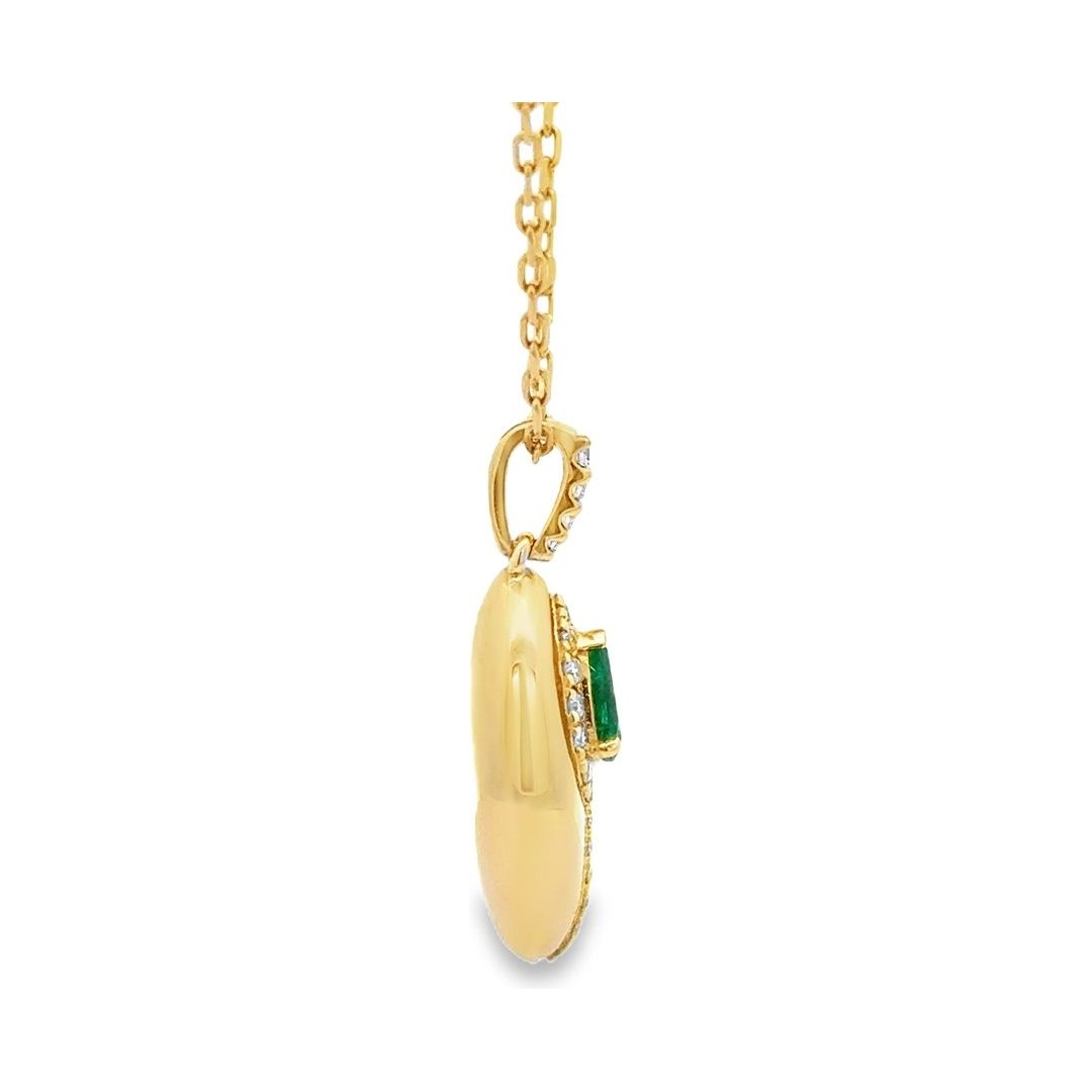 Combining smooth gold contours and brilliant gemstone sparkle, this necklace features a pear-shaped natural emerald adorned with natural diamonds. Crafted in 18K yellow gold, it brings a modern twist to classic emerald luxury.