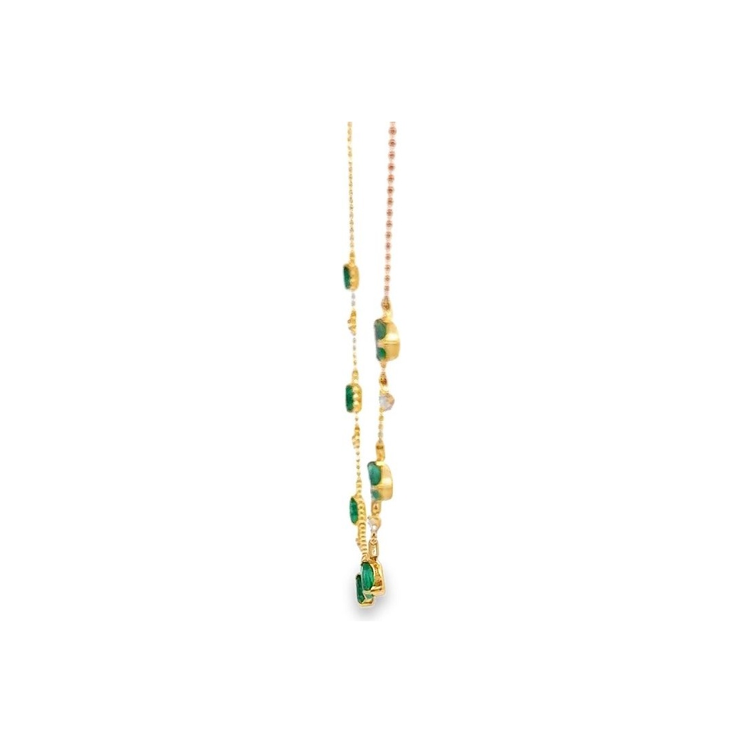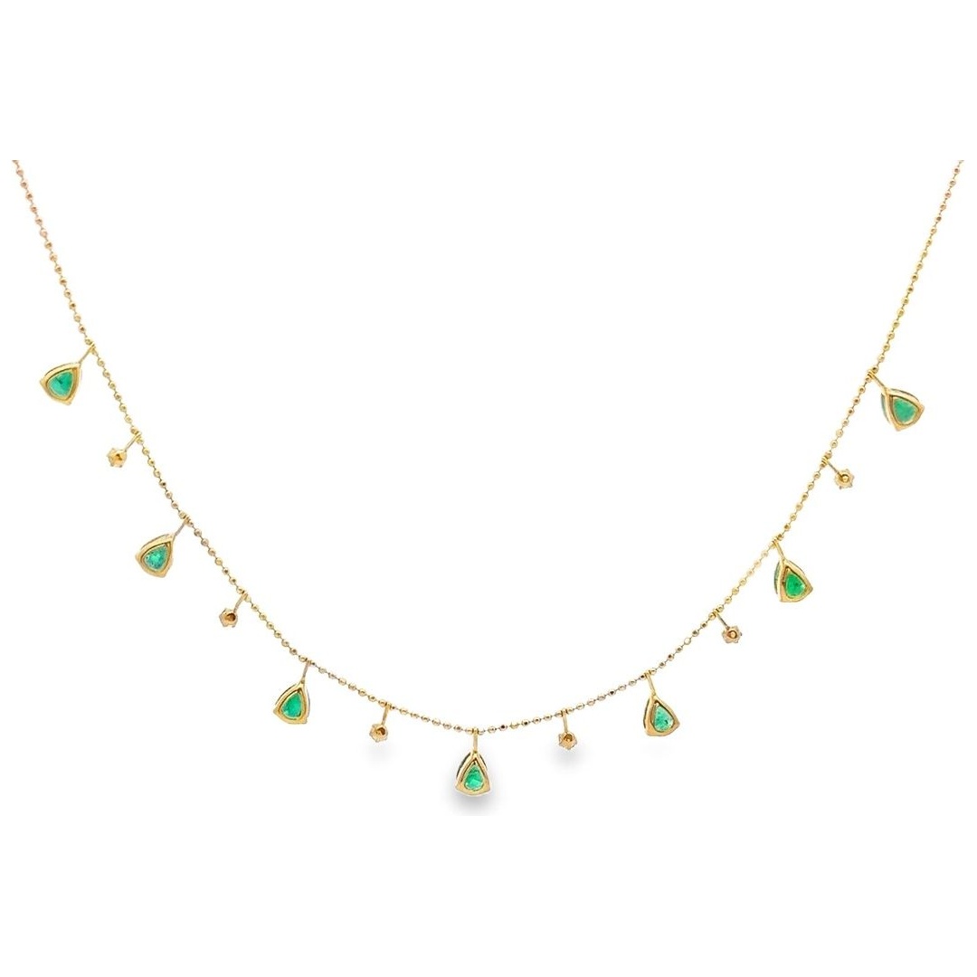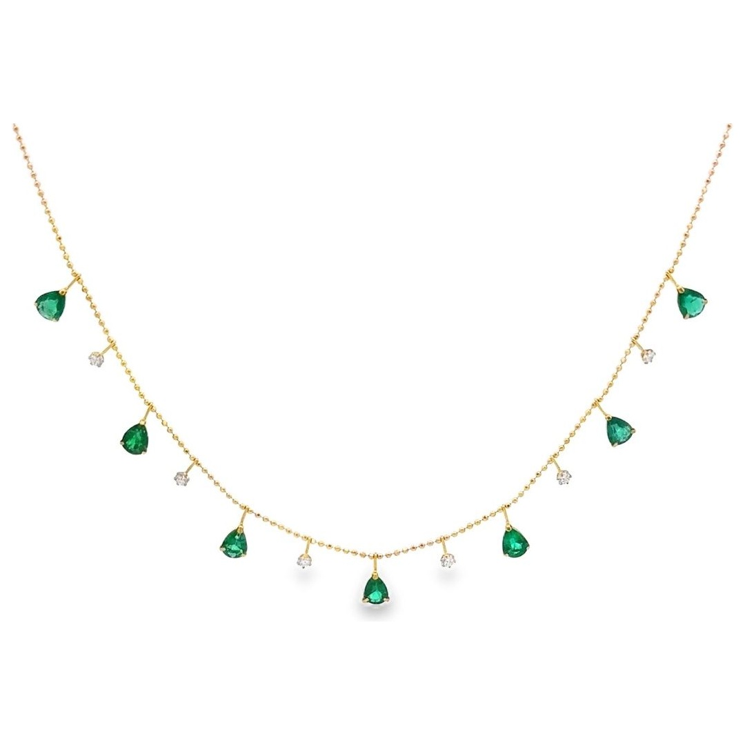 An enchanting creation from Gandy Jewelry, this necklace showcases alternating pear-cut natural emeralds and round natural diamonds, gracefully suspended along an 18K yellow gold chain. A luxurious symphony of brilliance and color.