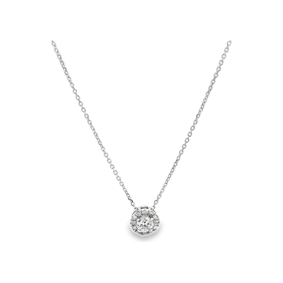Timeless brilliance defines this elegant Gandy Jewelry necklace, showcasing a round-cut natural diamond encircled by a halo of smaller natural diamonds, all crafted in 18K white gold. Its refined simplicity makes it a signature piece for both everyday sophistication and evening allure.