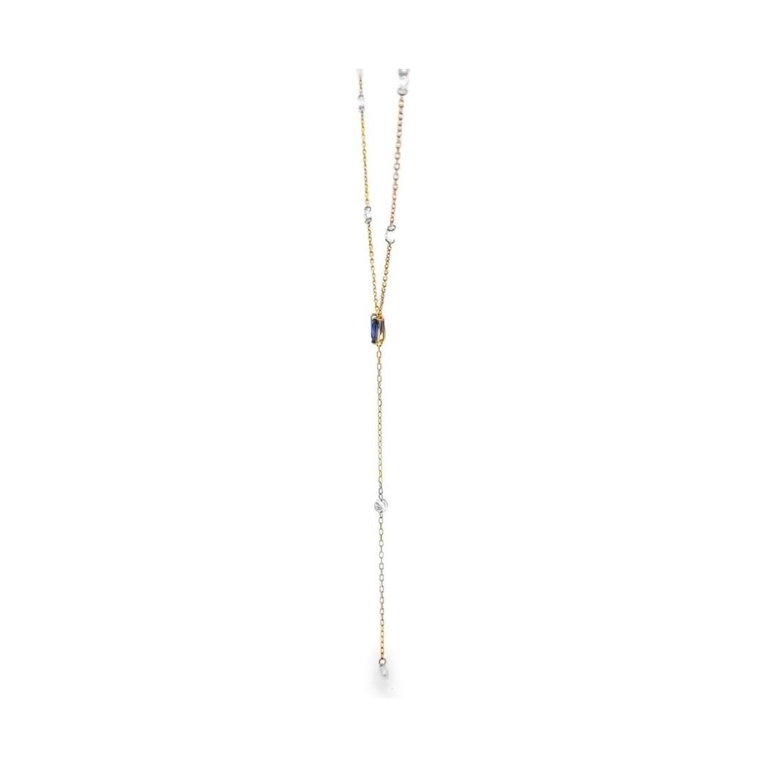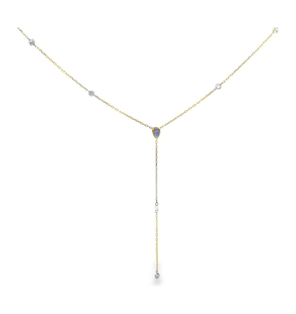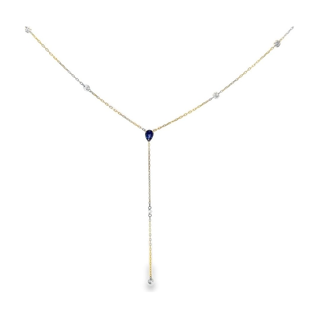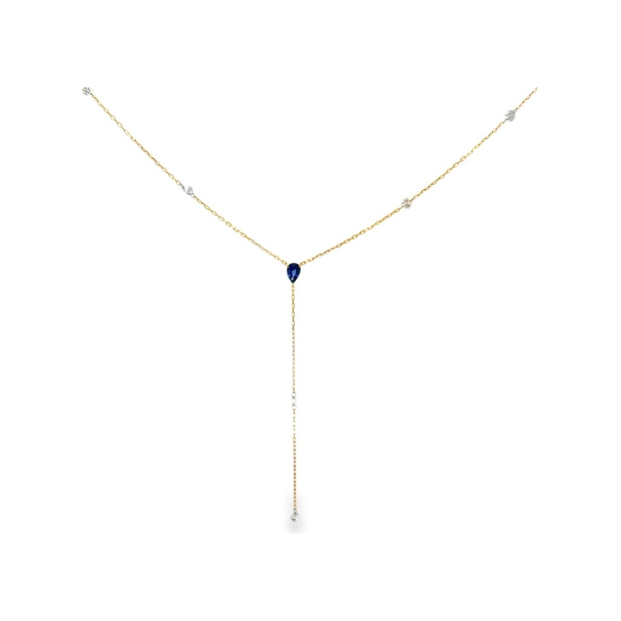 Radiant sophistication meets delicate artistry in this Gandy Jewelry Y-shaped necklace featuring a pear-cut natural sapphire complemented by sparkling natural diamonds, all crafted in 18K yellow gold. A statement of elegance and depth, perfect for any refined occasion.