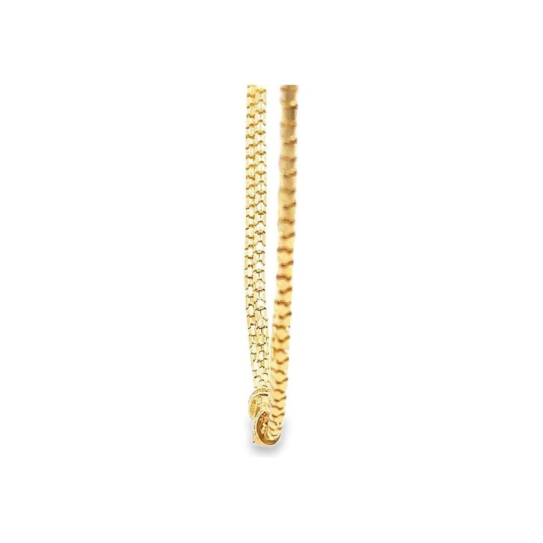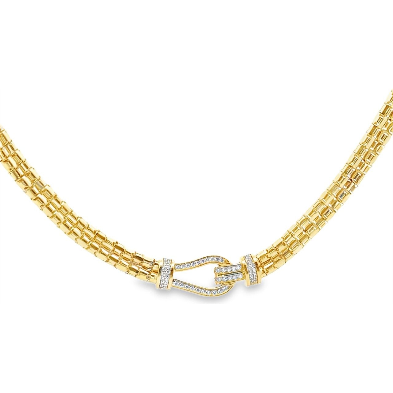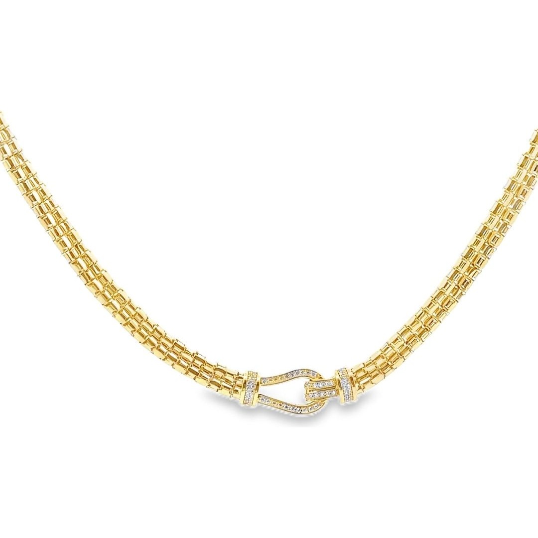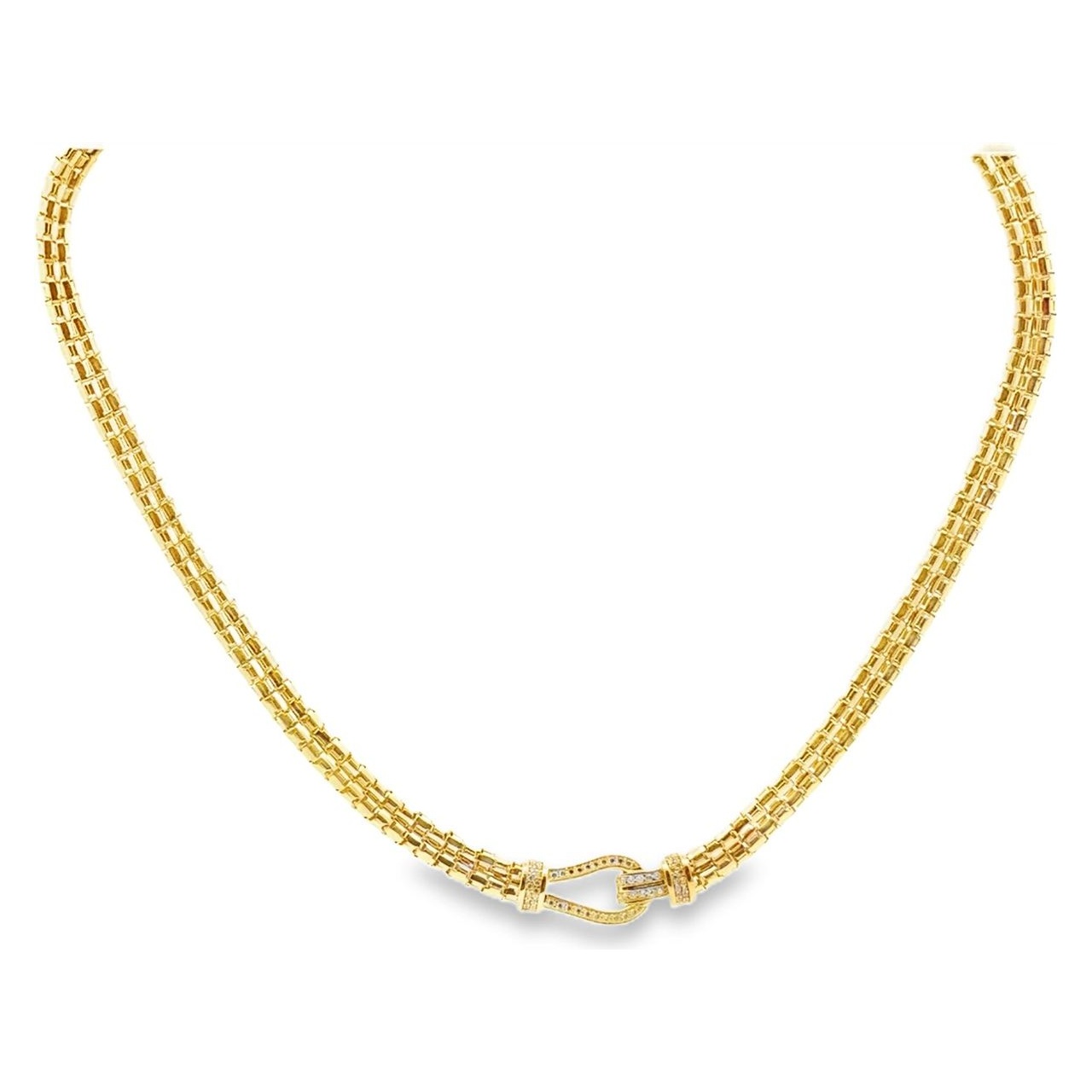 Crafted in 18K yellow gold, this refined necklace showcases a woven link design that flows with graceful strength. At its center lies an interlocking clasp adorned with a synthetic stone, adding a subtle touch of color and modern sophistication. The design captures harmony between bold geometry and timeless elegance — a statement of refined taste.