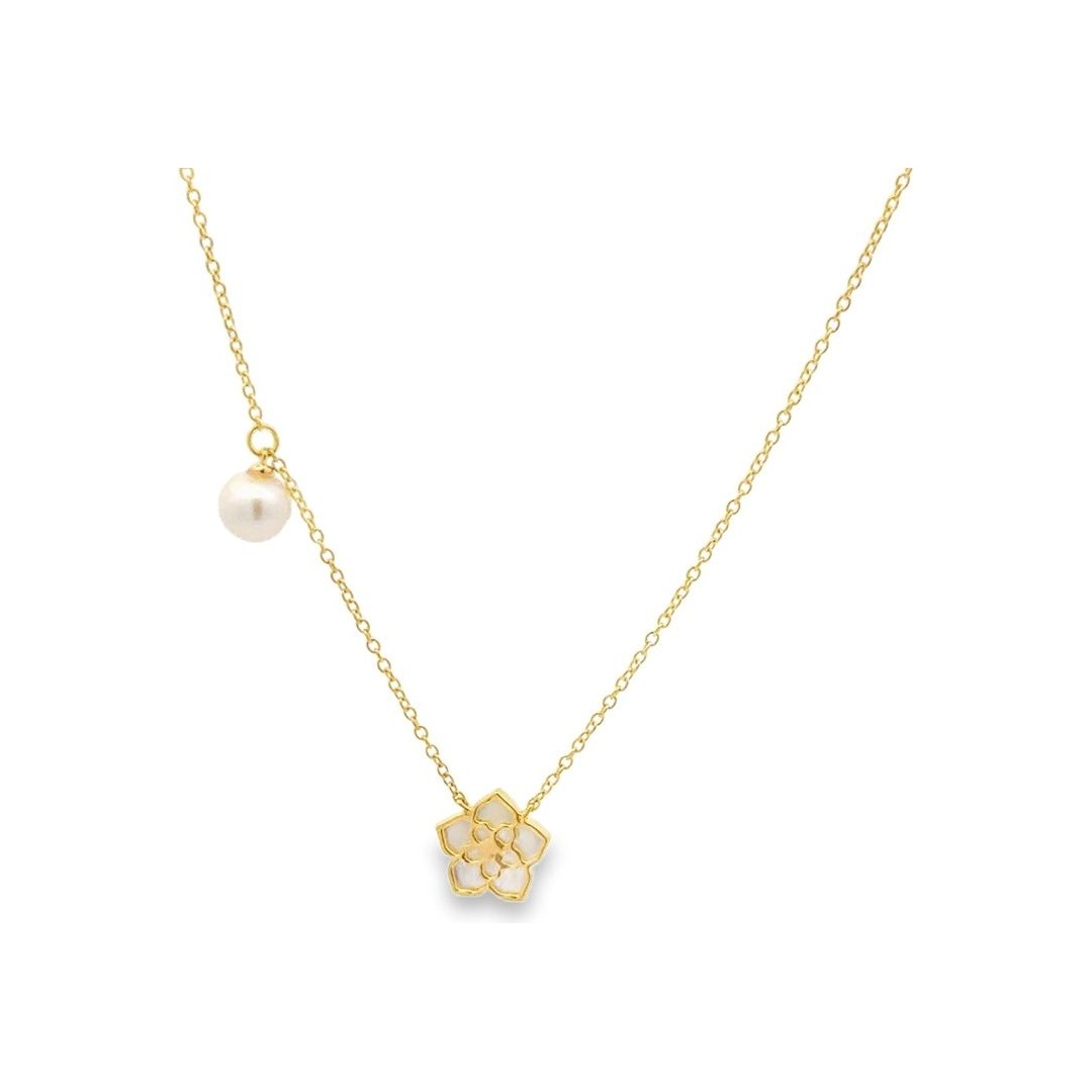 Radiating charm, this 18K yellow gold necklace showcases a clover motif crafted from mother of pearl with a sparkling natural diamond at its heart, accompanied by a floating pearl. A contemporary symbol of luck and love.