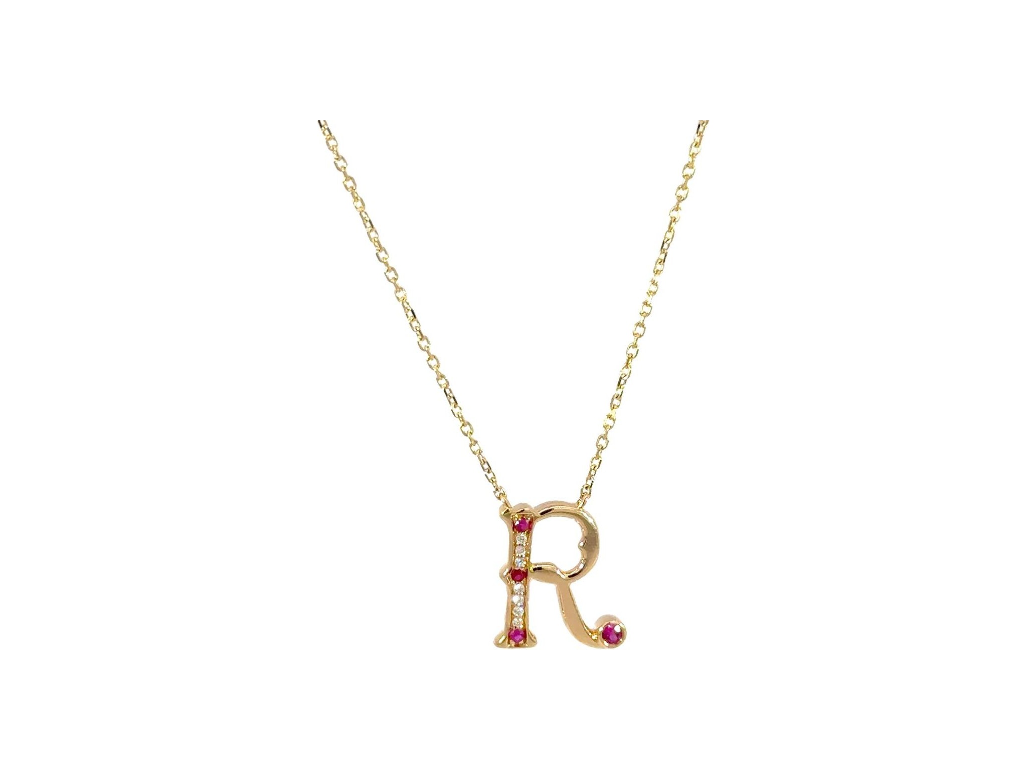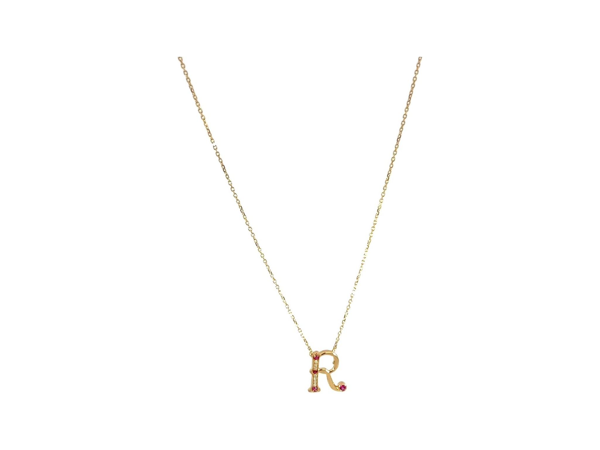 18 k yellow gold R necklace with natural diamonds and natural Ruby