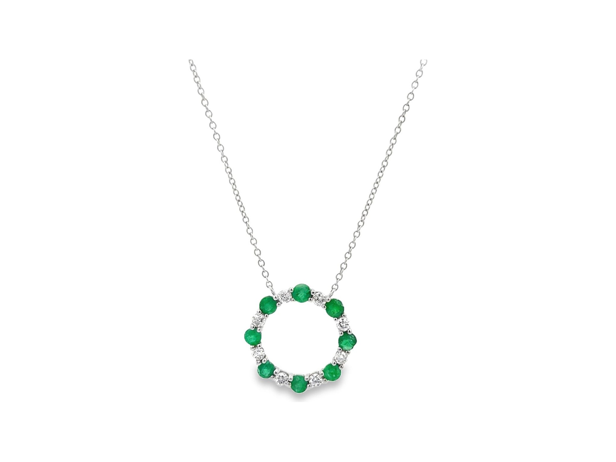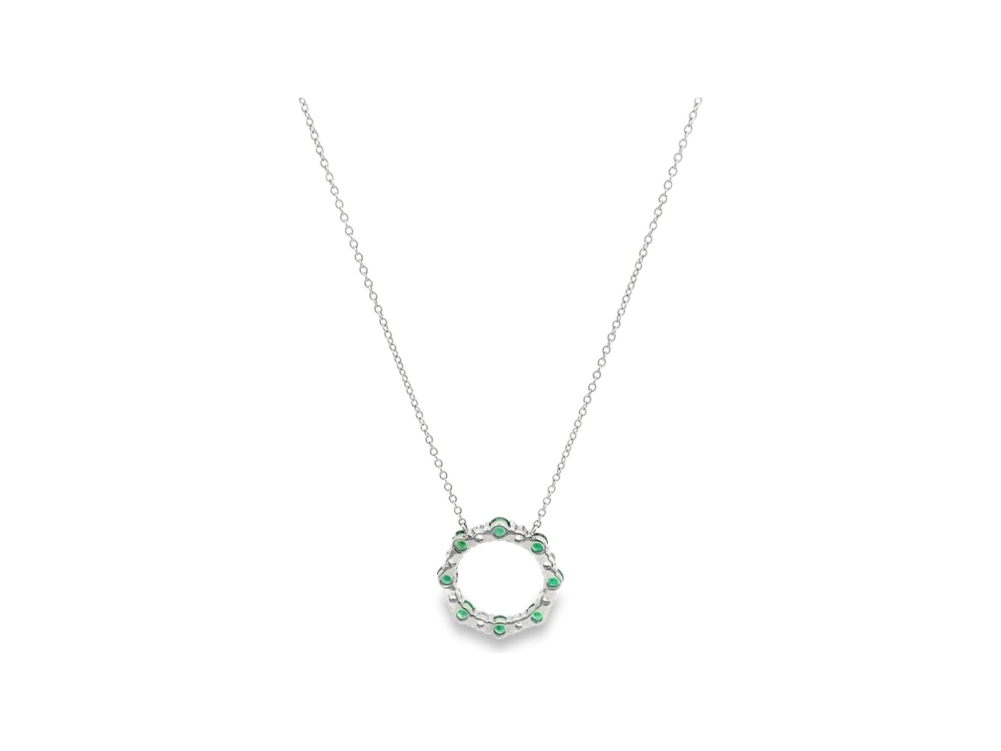 18K White Gold Circle Pendant Necklace with Natural Emeralds and Diamonds