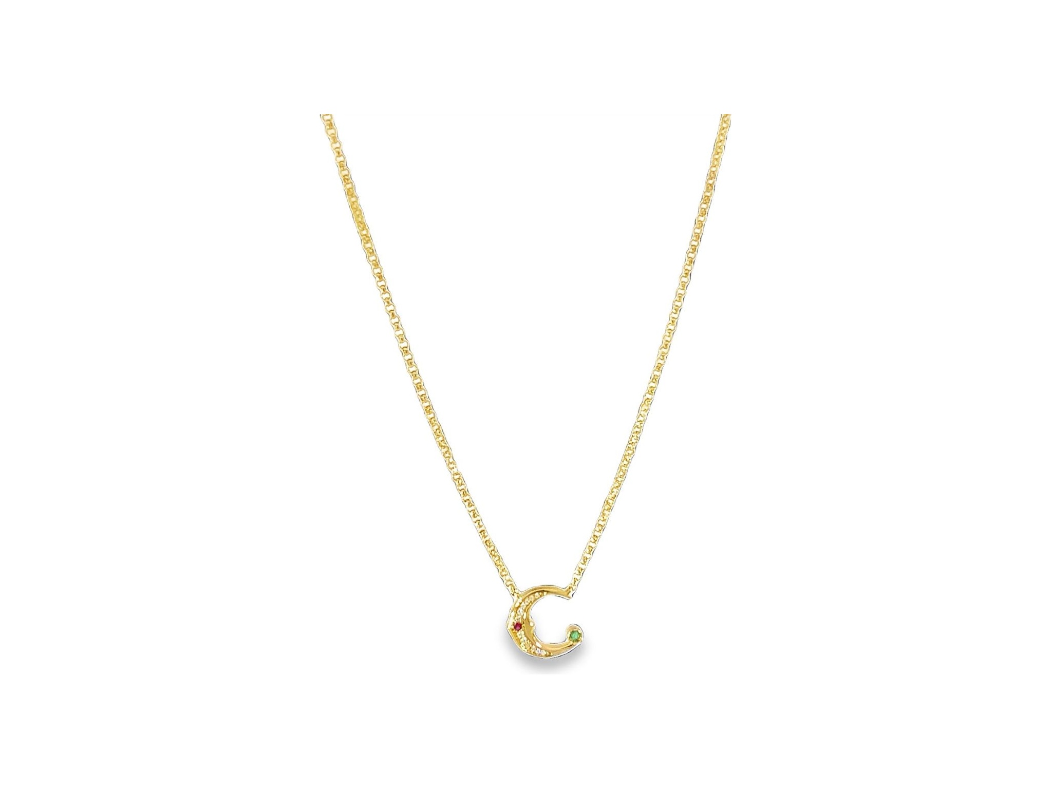 18k yellow gold C necklace with natural diamonds and ruby and emerald