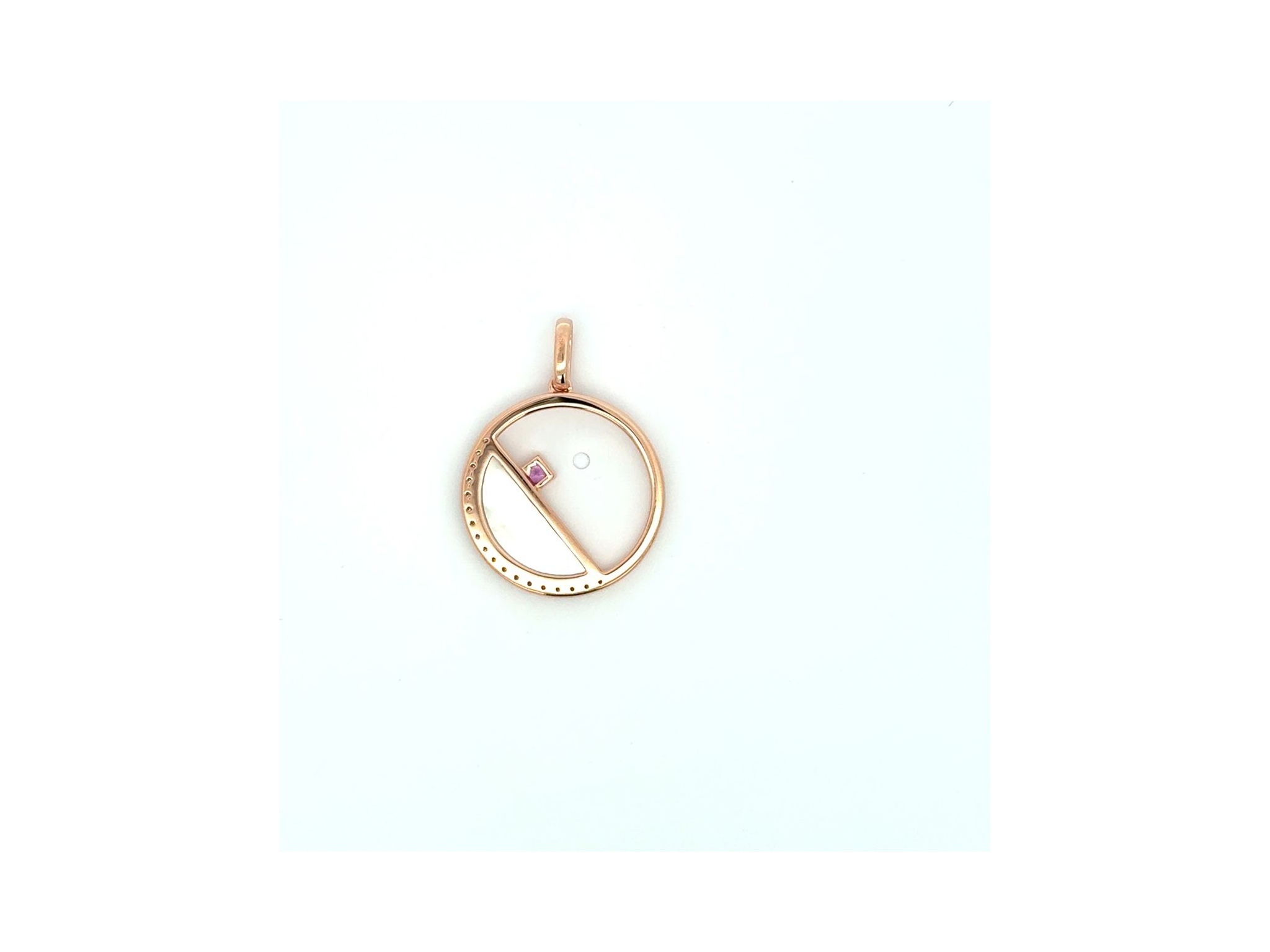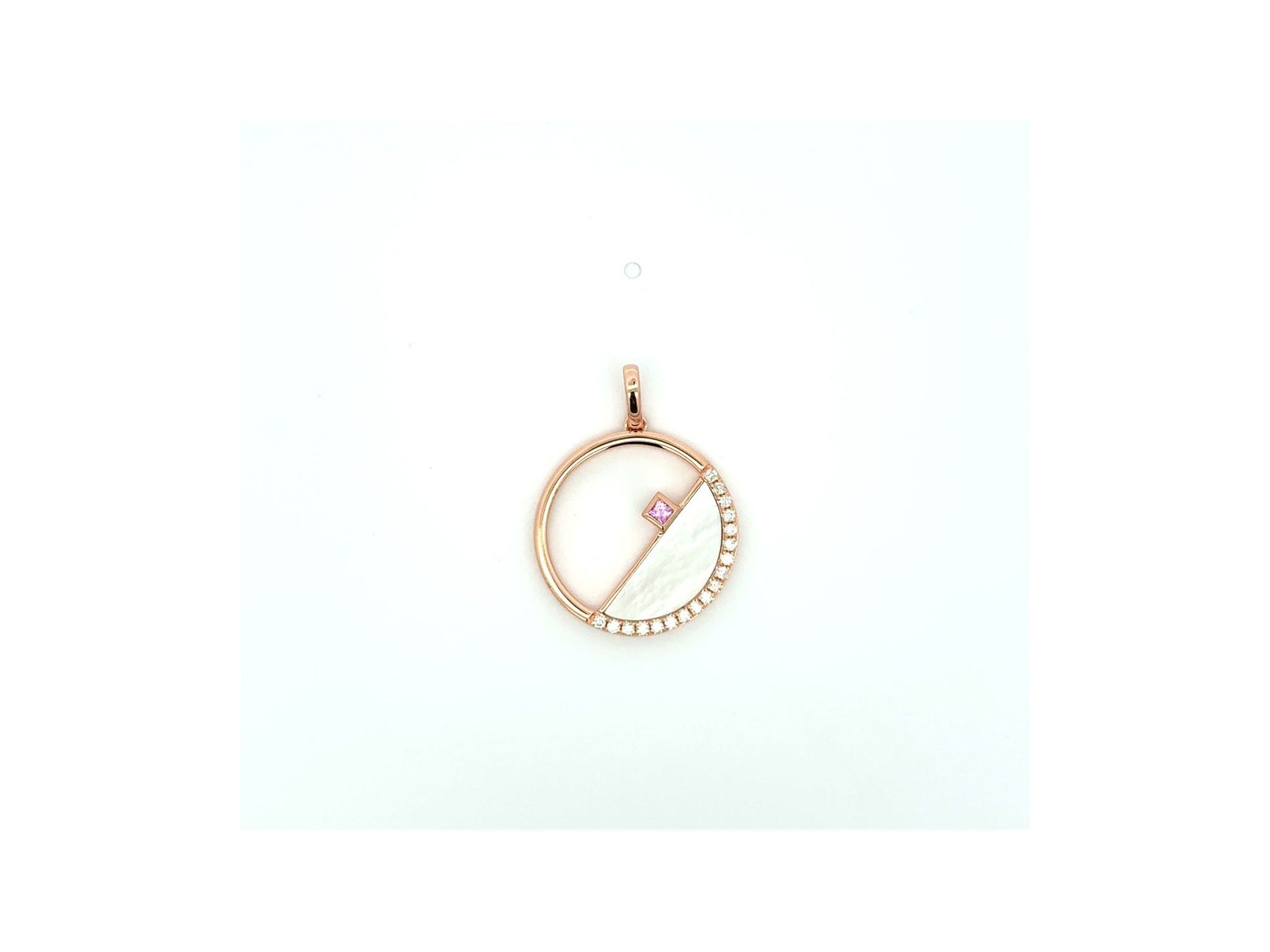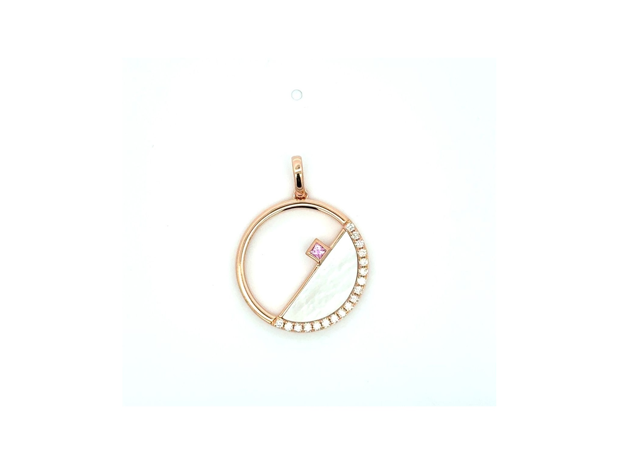 18K Rose Gold Round Pendant with Mother of Pearl, Natural Diamonds and Pink Sapphire