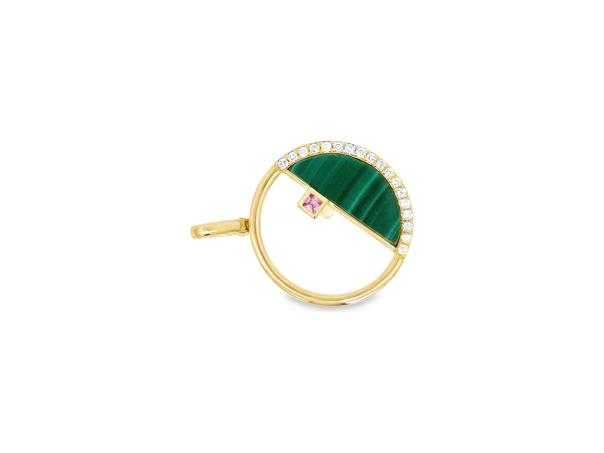 18K Yellow Gold Round Pendant with Malachite, Natural Diamonds and Pink Sapphire