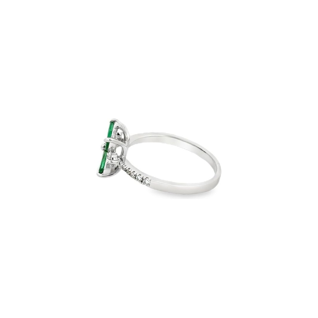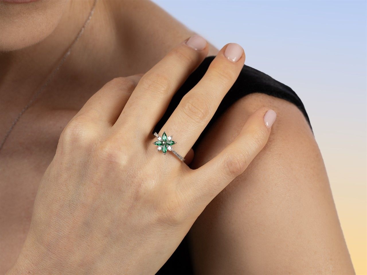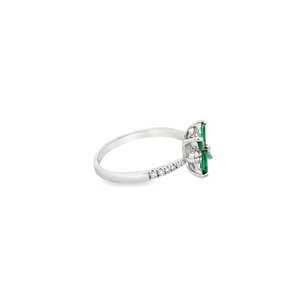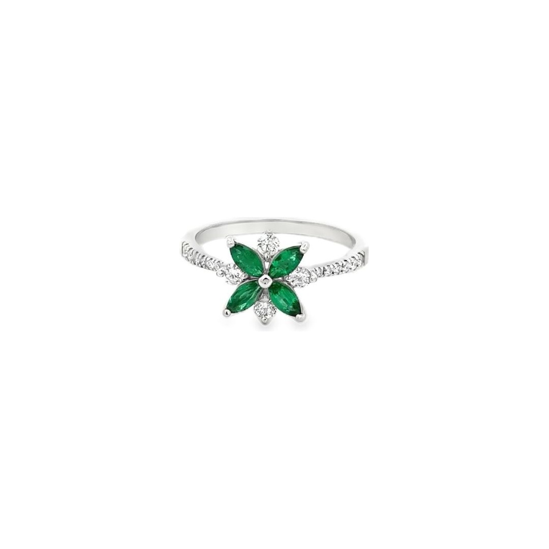Four marquise natural emeralds bloom into a beautiful floral silhouette, highlighted by natural diamonds for added sparkle. Crafted in 18K white gold, this ring adds a touch of nature-inspired sophistication to any outfit.