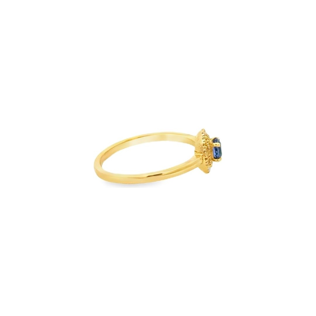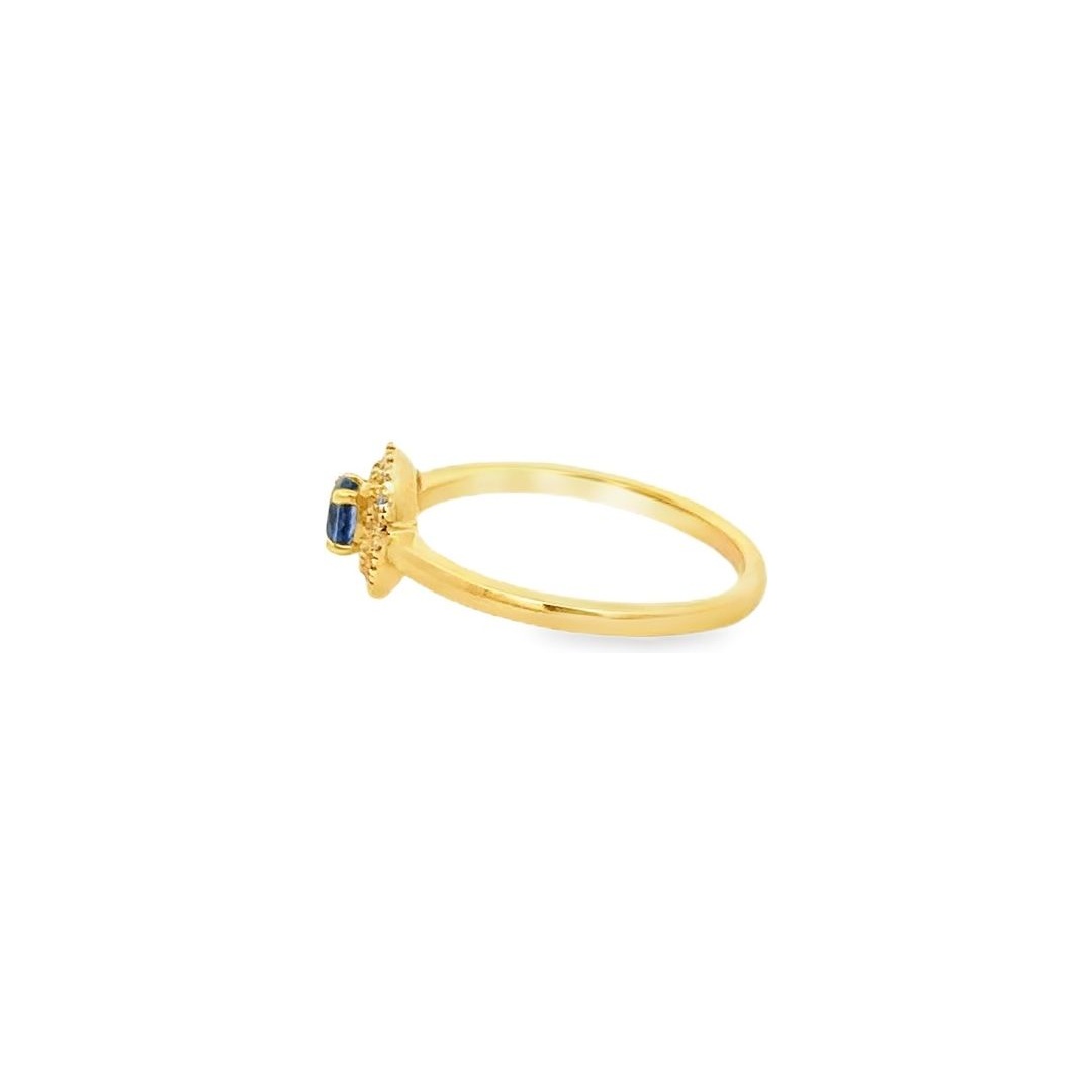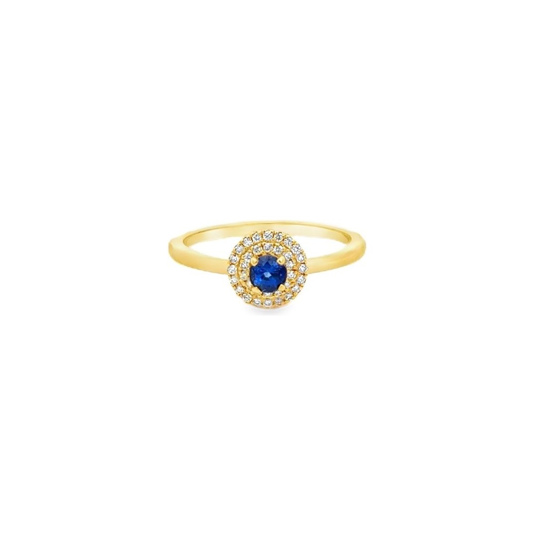 A rich round natural sapphire stands at the center, surrounded by a sparkling halo of natural diamonds in 18K yellow gold. A classic and timeless ring that never goes out of style.