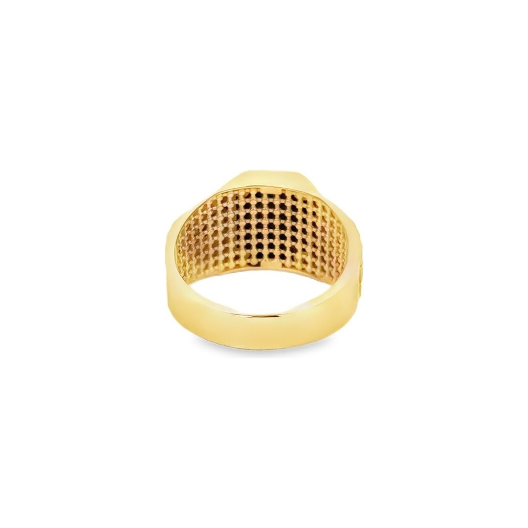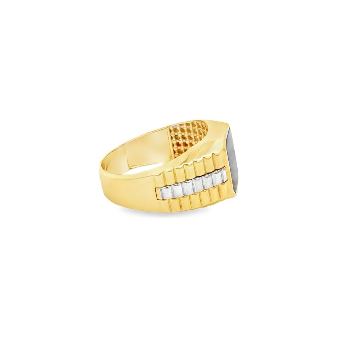 A striking 18K yellow gold men’s ring featuring a black onyx centerpiece, . The bold rectangular frame is complemented by a robust gold band with contrasting black detailing, merging timeless craftsmanship with a modern masculine edge.