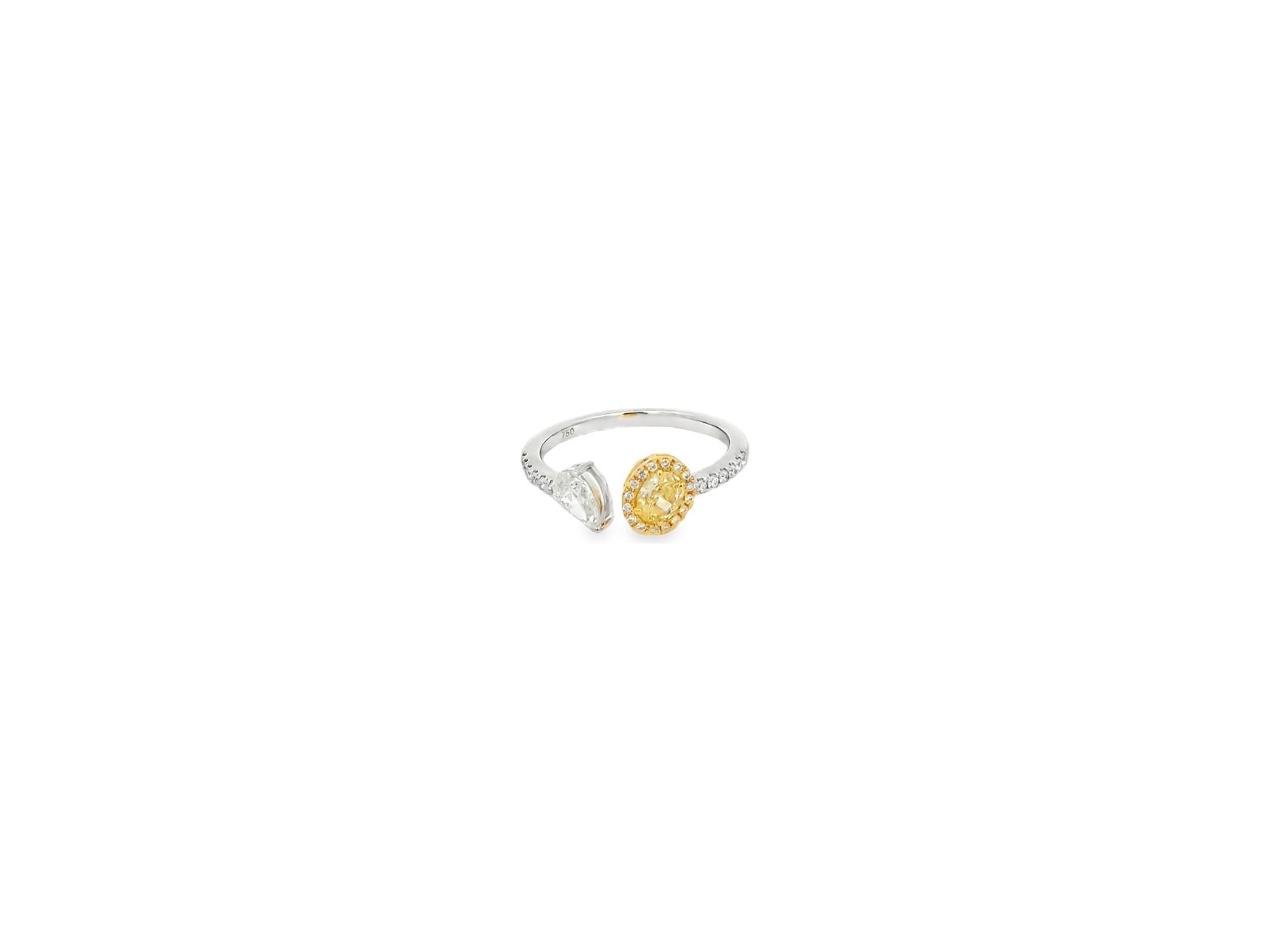 18K White Gold Open Band Ring with Natural Fancy Yellow Oval-Shaped Diamond, White Pear-Shaped Diamond, and Pavé Round Diamonds on the Band