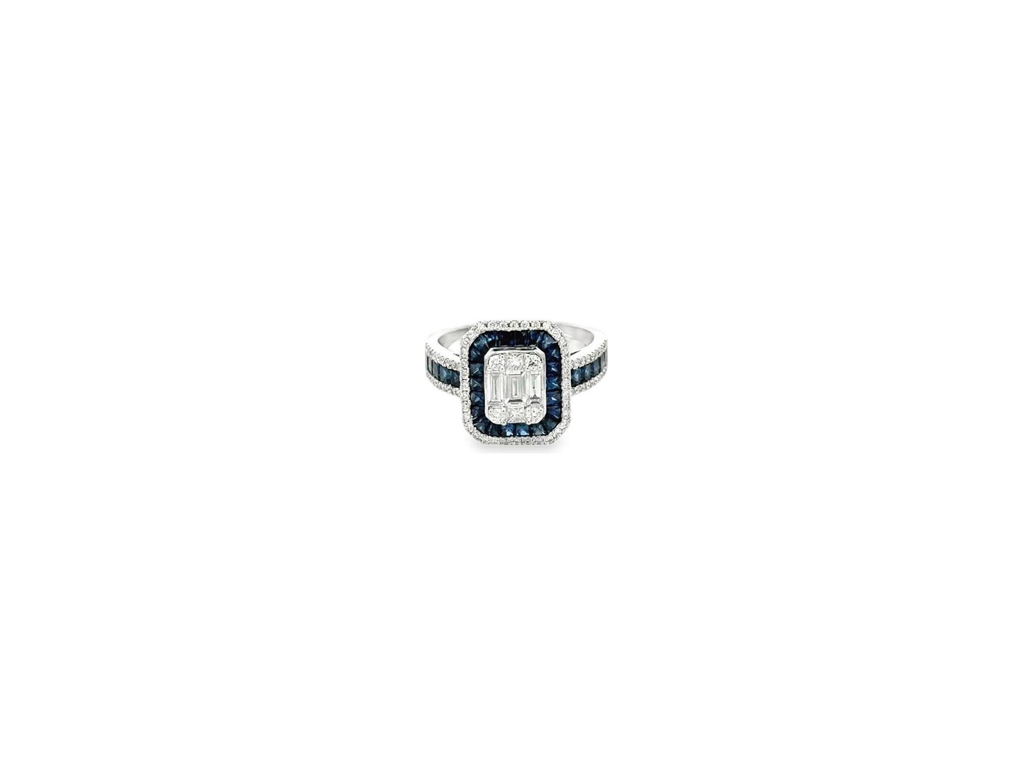 18K White Gold Ring with Natural Baguette-Cut Diamonds, Blue Sapphire Halo, and Outer Round Diamond Halo